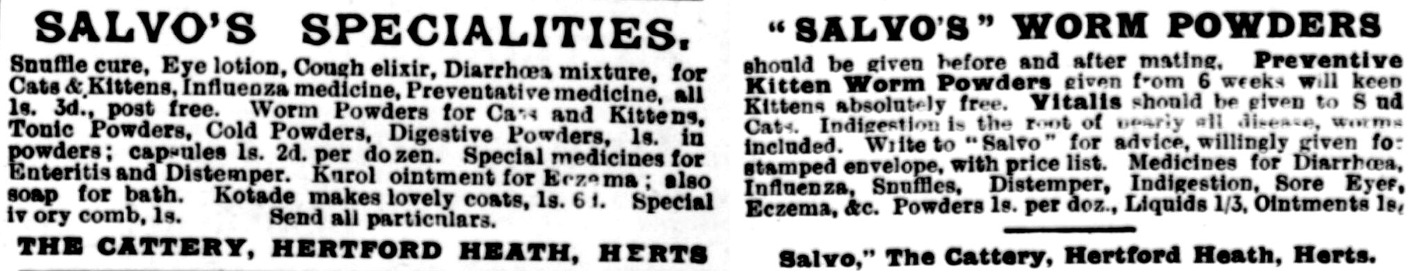 Transcripts from this case (or series of case as there were counter-claims) are at the foot of the page as they are lengthy. Bearing in mind that Miss Terrill was a cat hoarder whose home in Perranporth was found to be unsanitary and who was known for erratic behaviour and not paying bills, her cats' illnesses would have been caused by her own neglect and improper feeding. Either she was trying to avoid paying bills or she was suffering delusions. The cases were reported in blow-by-blow detail in Fur and Feather, and involved Miss Terrill, Miss Derby-Hyde, Miss Gant, and Mr. Burns (aka "Salvo" who claimed to be a cat expert and who sold "medicines" but who had not veterinary training).