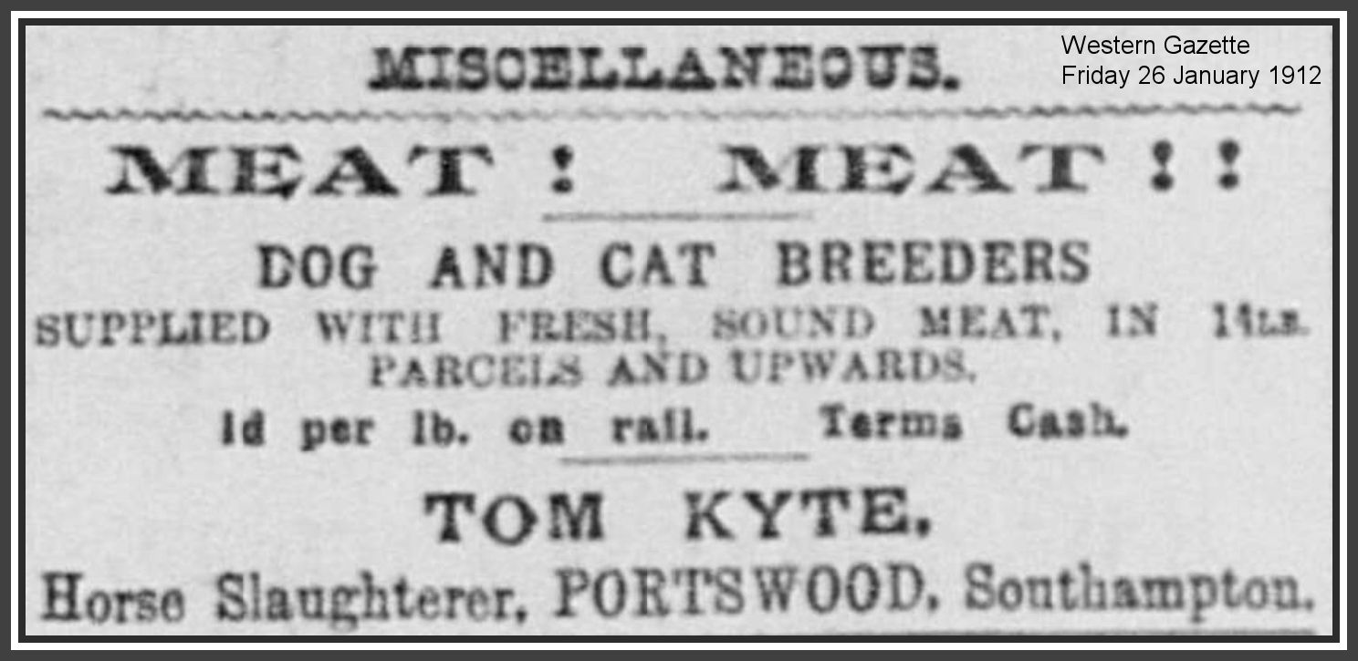 While the rise of the motorcar was gradual, the outbreak of World Wars badly affected trades that were dependant on horseflesh. Horses were requisitioned for war use and the lesser quality animals, that might once have been sold off and replaced, were kept by their owners. From the inquest into the death of Louis Martinelli (aged 70), of 21, Tunnel-road, a cat's-meat seller, we learn that the war had affected his business. “He had a job to get his meat from the Station, and had difficulty in supplying his customers as a result.“ He had 30s. to his name when he died (Kent & Sussex Courier, 1st January 1915). In 1917, on the grounds that he had lost three Government contracts and now had very little to sell, Thomas J. Wendes, a cat's meat purveyor, of Clifford-street, Southampton, applied for the reduction of a maintenance order of £2 a week made by the Court to his wife about six weeks ago. He put his average net profit at £3 a week – still an appreciable amount at the time (Hampshire Advertiser, 28th July 1917). Some cats'meat men argued that they were an essential trade and should not be called up for war service, such as the Ramsgate cat’s meat man who told the tribunal that if were called up would mean a severe loss to the cats, but whose claim was refused. (Surrey Mirror, 13th June 1916 )
