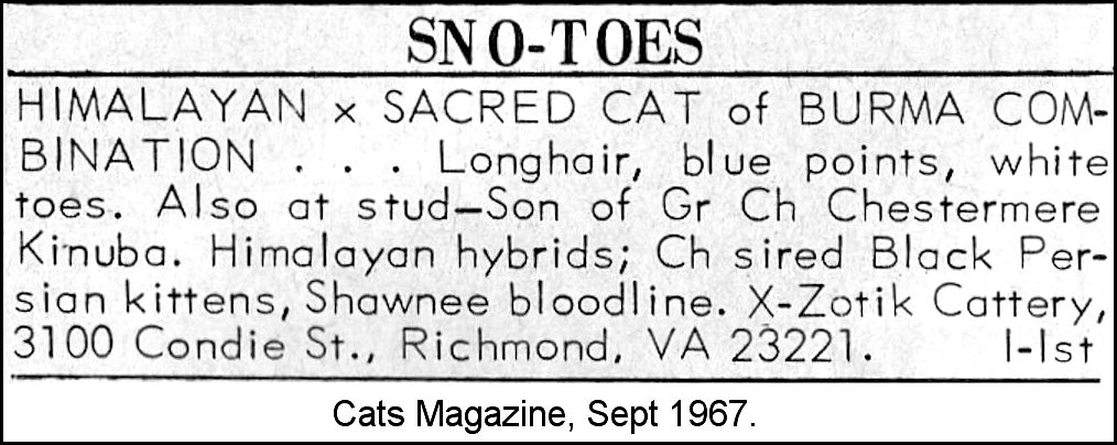 The Snow-Toes was bred in the late 1960s by crossing Birmans to Himalayans, seemingly with the aim of a mitted Himalayan, or to widen the Birman gene pool. Whether this will see a revival alongside the Snowshoe Siamese has yet to be seen.