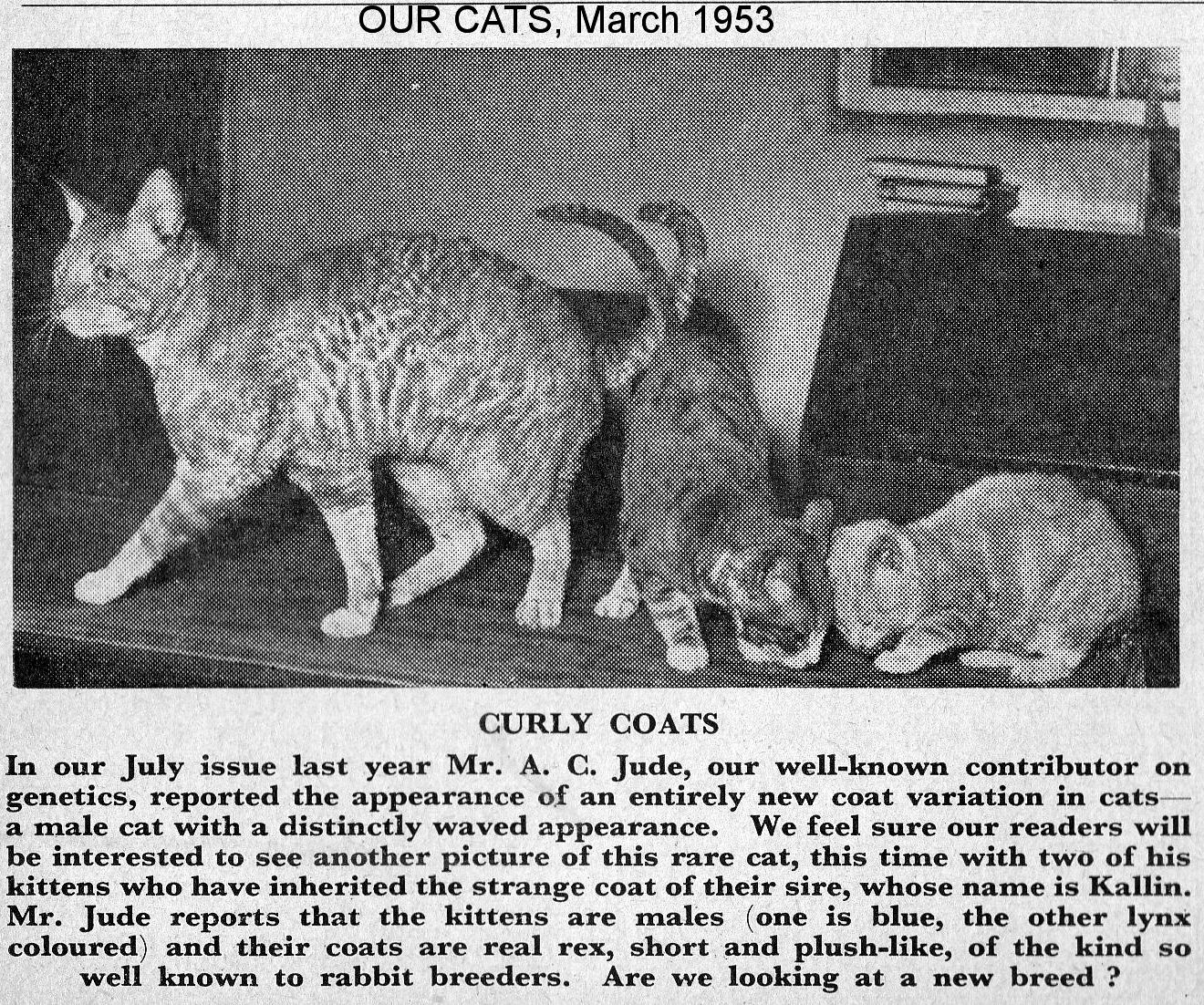 According to A.C. Jude, writing in Our Cats, December 1959, "The English Rex, for instance, was found to be carrying a lethal factor, whereas the German Rex mutant has consistently, in and through its progeny, produced only perfectly healthy stock." He mentioned that similar cats had been found in Lincolnshire and Ireland, but gave no specifics on locations.