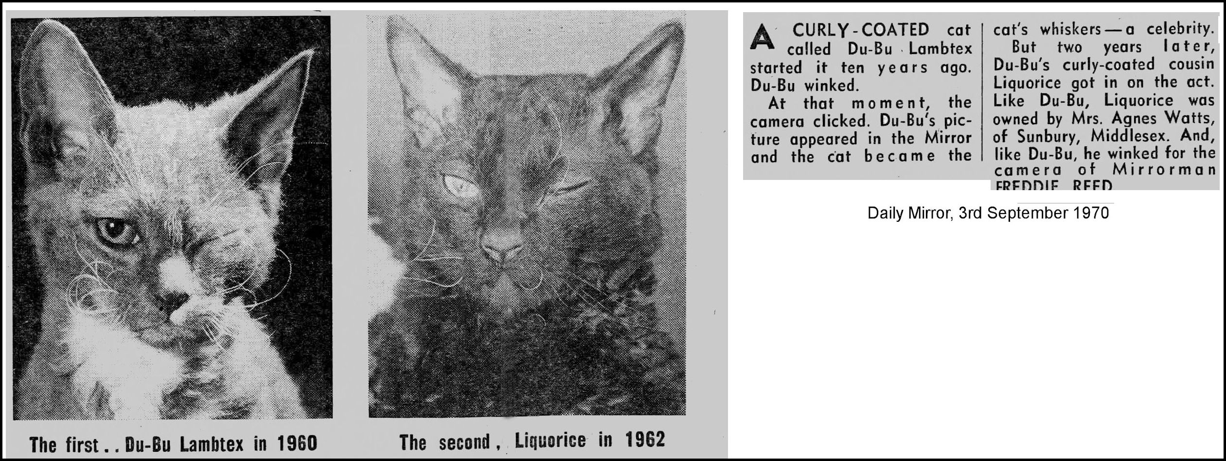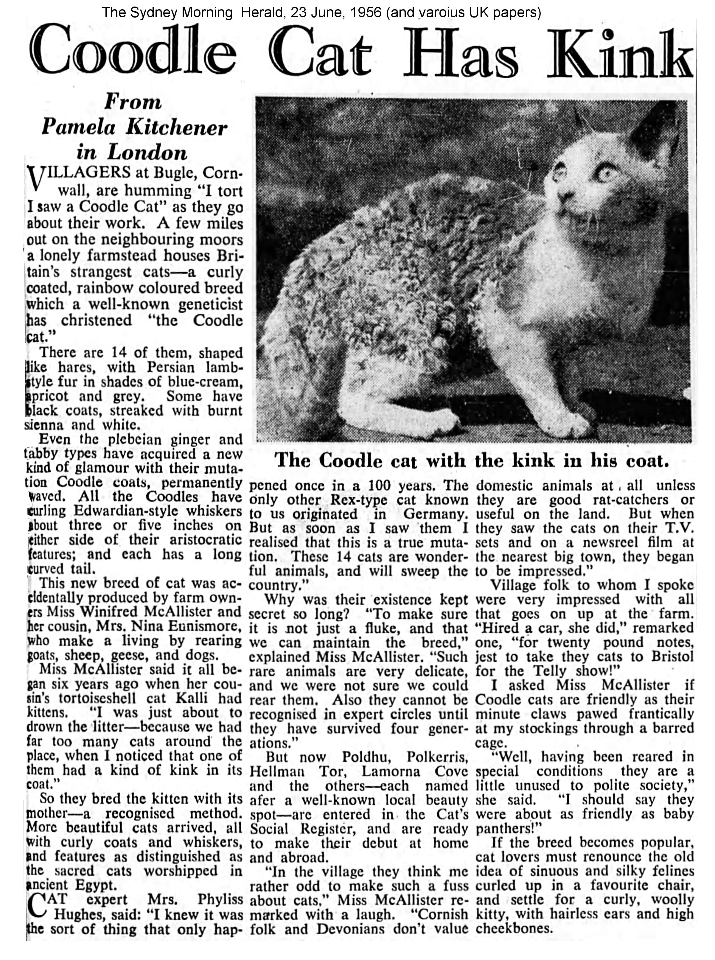 "When I first wrote about the Rex cats in 1962 I had quite a few letters from folk who claimed to have seen cats with curly coats. One came from a reader in Limerick who said she had seen a curly cat on her father s farm, but when I asked her to give more precise information she seemed unwilling to do so, so the idea of an Irish Rex was dropped from the picture." May Eustace, The World of Show Cats (1970)