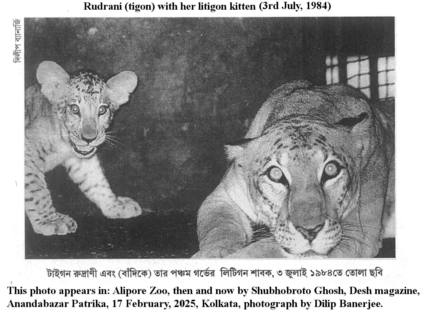 This photo of tigon Rudrani with her litigon kitten (her fifth litter) is from an article by Shubhobroto Ghosh in Desh magazine in Bangla, a premier publication known as the "New Yorker Of Kolkata," dated 17 February, 2025. The article is a history of the Alipore Zoo in Kolkata. It is believed to be the only photograph in the public domain where one can see a tigon(tiger x lion) and a litigon ([lion x tigon(tiger X lion)] in the same frame. The photograph is on page 7 and is dated 3rd July, 1984; it was taken by Dilip Banerjee of Anandabazar Patrika, a Bangla newspaper published from Kolkata that now has a readership of over 1.5 million readers every day.