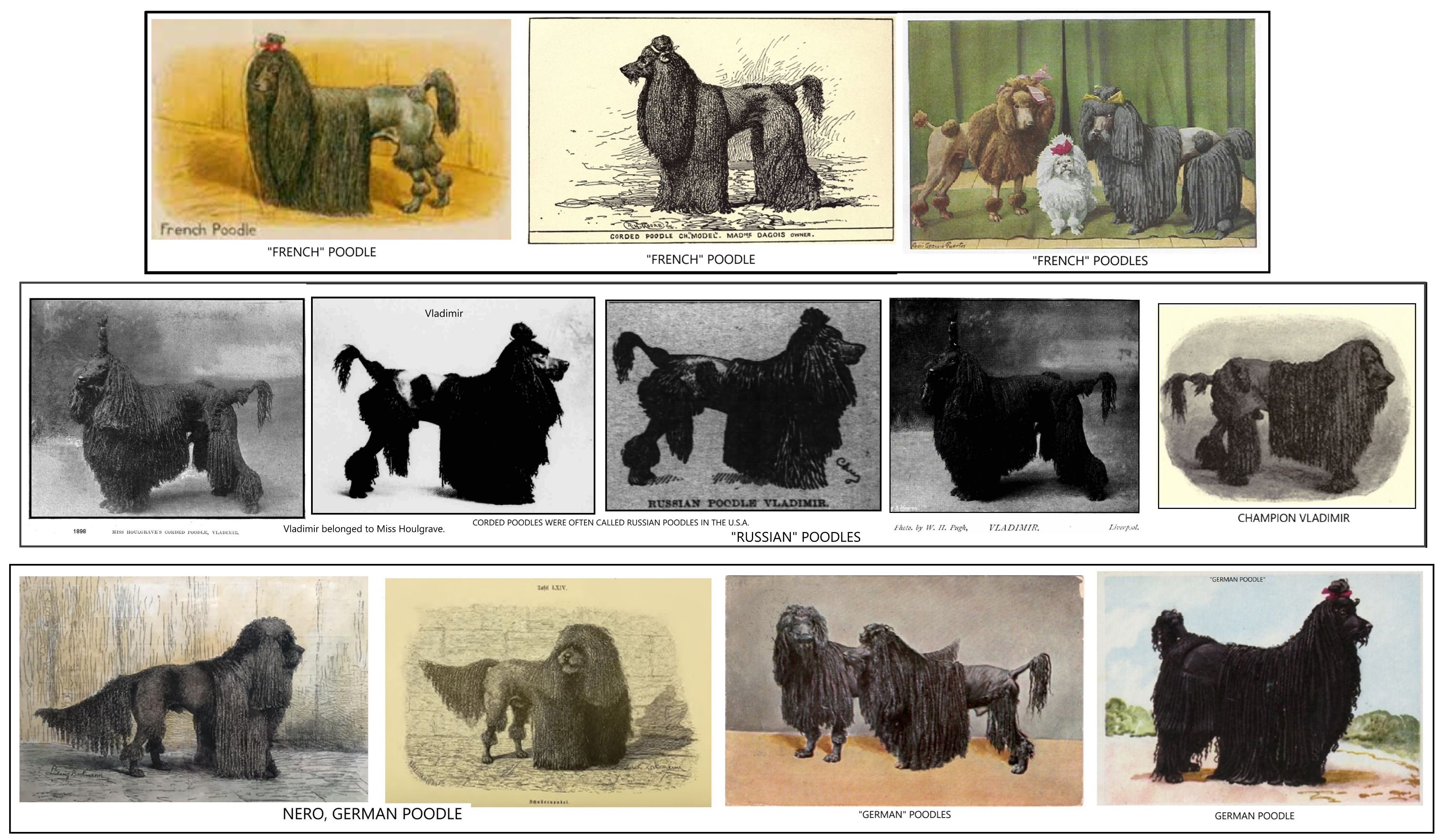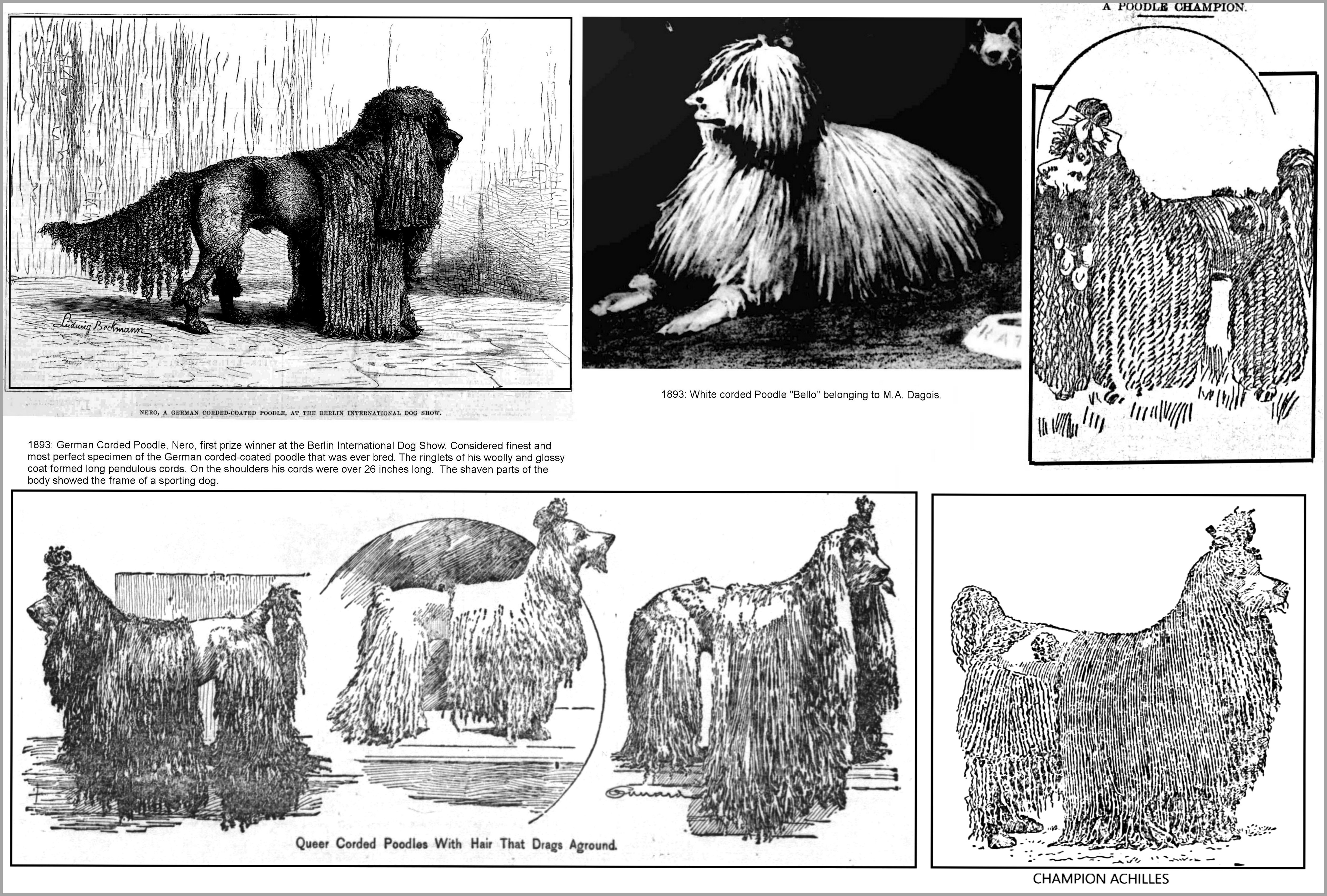 At one time it was thought that there were two varieties of poodles, the corded and the curly-coated varieties. The corded dogs were thought to be German poodles while the curly-coated variety was a "French Poodle." The Kennel Club's standard for the "curlies" was based on that for the conformation of the corded animal. The only distinguishing difference was the manner in which the coat was treated. If the hair was allowed to grow, it fell naturally into ringlets and if these were not brushed or combed, they formed long cords which could reach the ground (and sometimes were so long they dragged along the ground). The cords also attracted dirt and grease and hindered movement. The heavy, long coats must impede movement unless they were tied up. Eventually the corded Poodle was supplanted by the clipped Standard Poodle we see today.