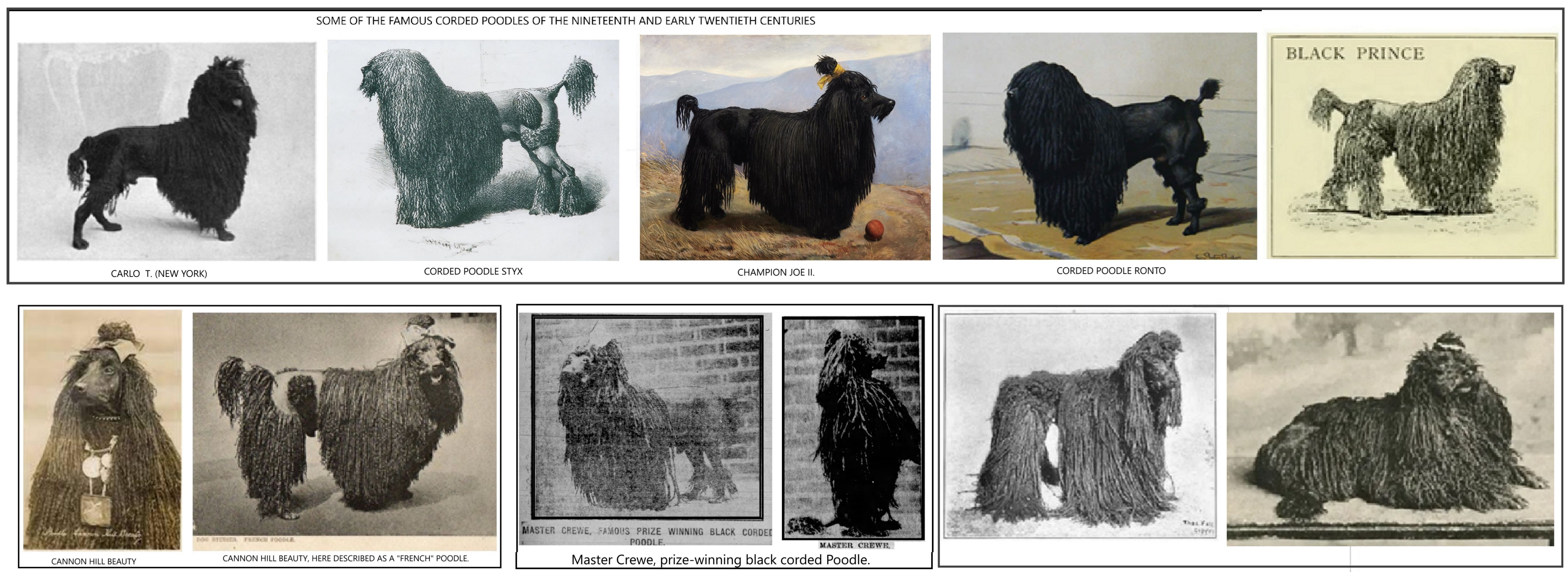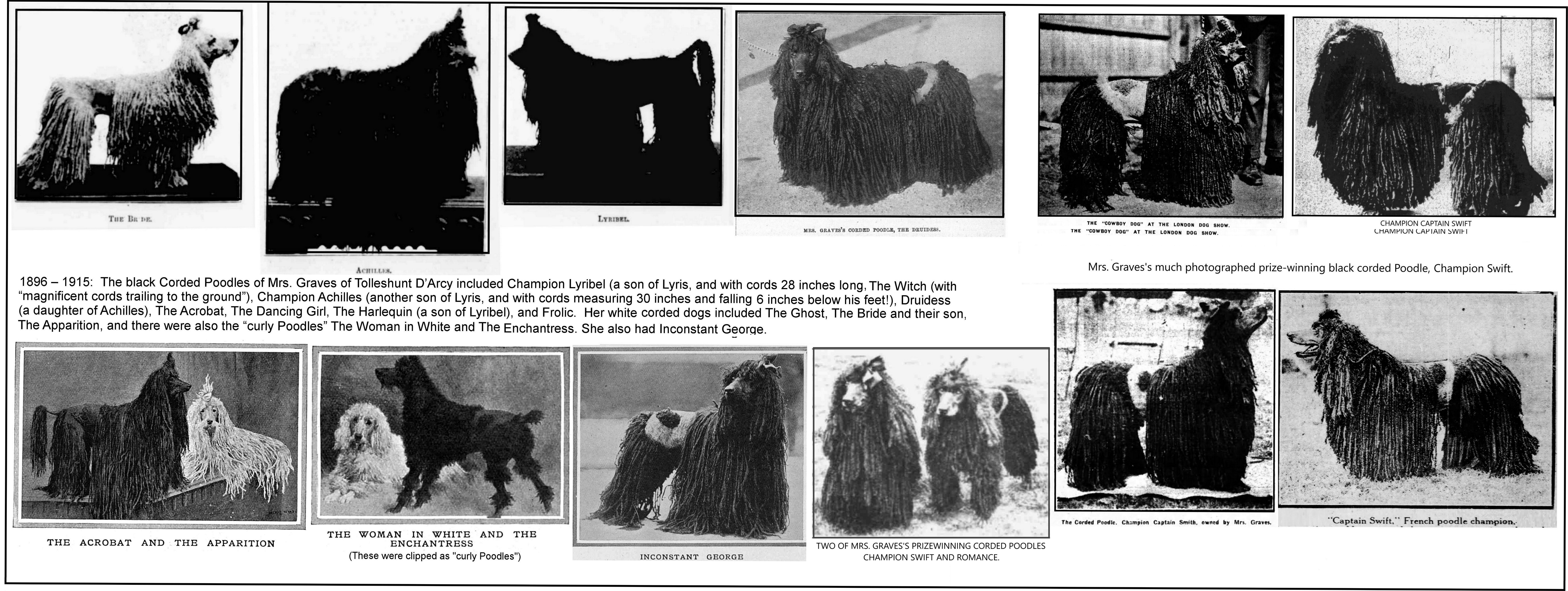 Their black corded Poodles included Champion Lyribel (a son of Lyris, and with cords 28 inches long), The Witch (with "magnificent cords trailing to the ground"), Champion Achilles (another son of Lyris, and with cords measuring 30 inches and falling 6 inches below his feet!), Druidess (a daughter of Achilles), The Acrobat, The Dancing Girl, The Harlequin (a son of Lyribel), and Frolic. Her white corded dogs included The Ghost, The Bride and their son, The Apparition, and also the "curly Poodles" The Woman in White and The Enchantress. They also had Inconstant George.