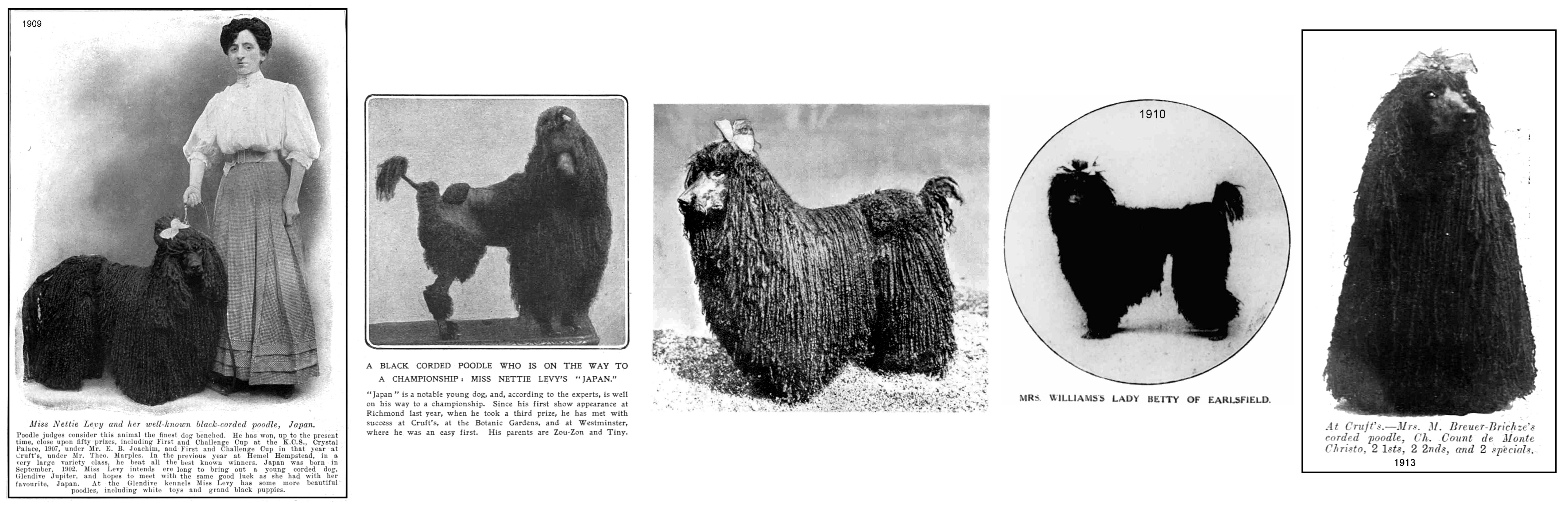 Mr. R. V. O. Graves and Mrs. W. Graves, of Tolleshunt D'Arcy, specialised in corded poodles and some of their dogs had cords of over a yard in length which lay for twelve inches or more on the ground. Mr. Graves's method for getting the long cords was to never touch the coat with comb or brush, but to keep it free from mats by using the fingers as a comb.