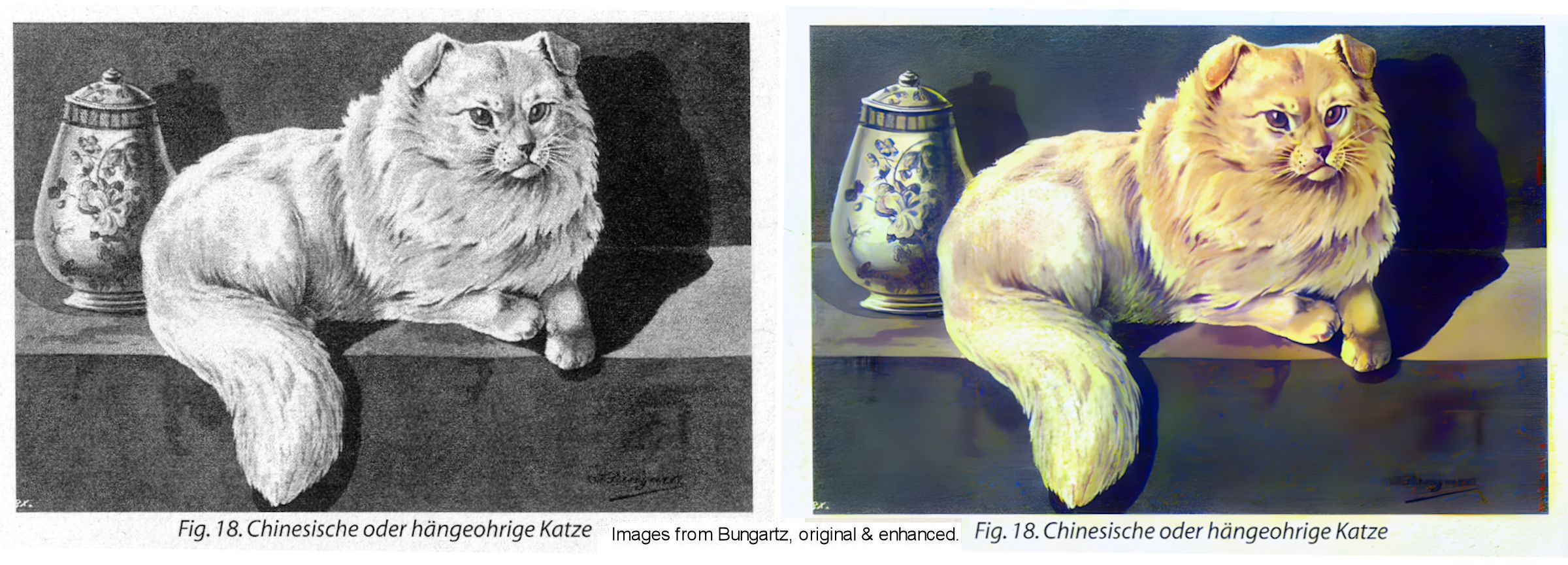 This was followed up in Cat Gossip on 18 May, 1927 in More About Chinese Cats by the same author: In the hope of obtaining further information for you as to these cats, I have inquired of Dr. Giles, at the British Museum, and he has turned up every reference book in the Museum, but without result. He suggests the Natural History Museum, but that, of course, you have tried. A Buddhist priest took me round the Temple where I saw the Drop-eared feline as a mural painting. The painting was in a room behind the high altar. A dusty place, with an enormous Buddha at the end. The cat was life-size, and lying on a branch snarling. I forget the exact place, but I believe it was up Kalgan way, towards Mongolia. I have seen so many Temples, so many mural paintings, especially of felines, notably in Japan. In my travels I have only come across the ordinary felines.