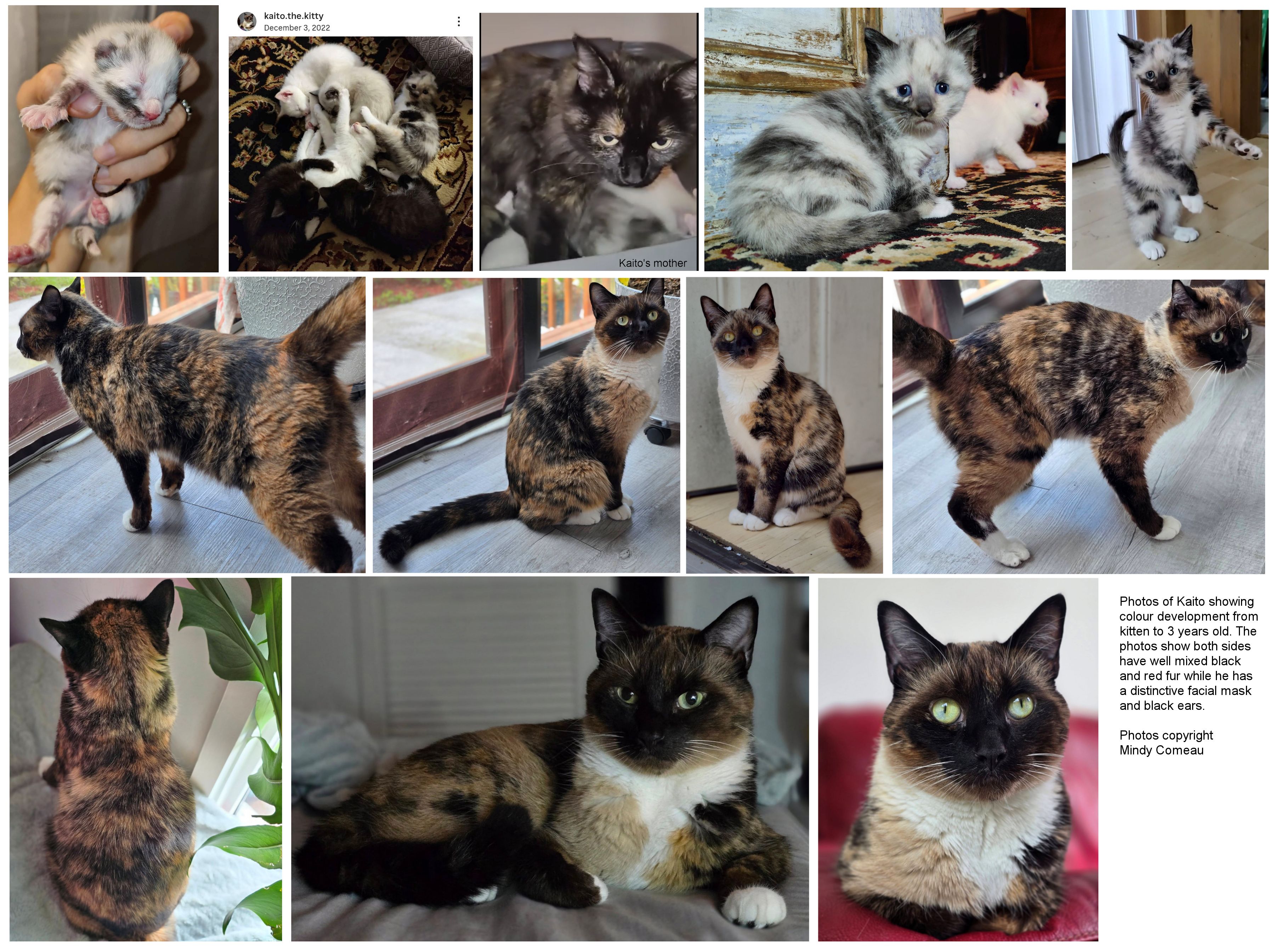 The general consensus is that Kaito absorbed a tortie sister in utero and that he was supposed to be a seal point or seal mink. He continued to get darker and seemed to reach his final colouring around 3 years old, showing a distinct mask and black ears. When he was neutered there was no evidence of female reproductive organs, so he was not hermaphrodite or intersex. Although it is hard to see in the photos, his eyes are mainly yellow with a small blue sector (heterochromia); his unknown ancestry means he didn't get the eye colours associated with pedigree mink or sepia cats. Because the eyes form as part of the skin surface in the embryo, this might be due to his mosaicism, but it can also occur randomly. Genetic testing at Petgeno is planned.