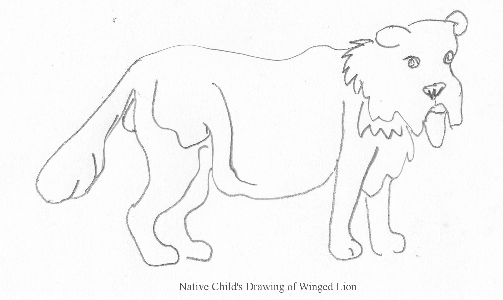 In September, a native man employed in the capacity of handyman reported to me a "lion with wings". As is so often the case in this region, the news reached me through a circuitous route. His brother in a village several miles to the north-west of Mombasa had been given a drawing of the lion, which been made by a child at the missionary school run by a Carmelite sisterhood. He had been instructed by the good sisters to convey the drawing to Doctor Dunstable. One of the sisters, Sister Cecilia, had, additionally, penned a short description of the beast and this was also relayed by the handyman's brother. I take the liberty of reproducing the drawing here.