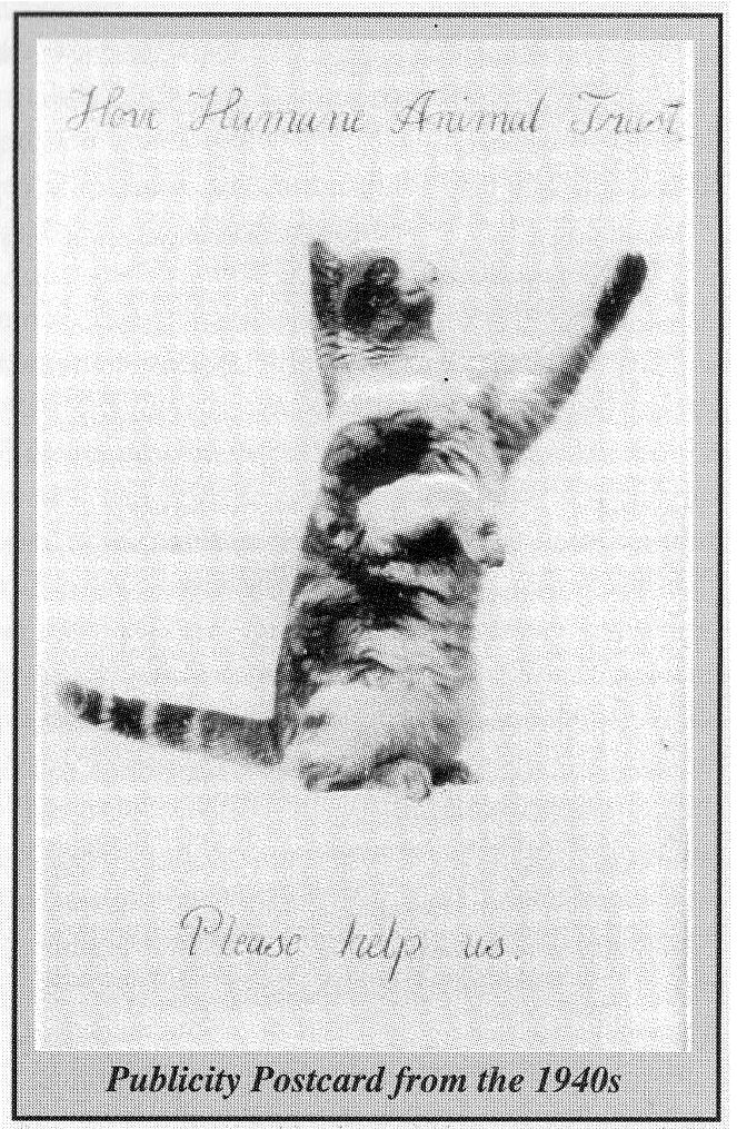 "In the life of the C.P.L. a number of Societies whose interest were mainly cats, and some cat magazines appeared and disappeared: we recall the activities of the Feline Defence League founded in 1902 by the late Miss Kate Cording, a copy of the F.D.L.'s terms of reference is on our files. It is interesting to note, that their brochure states "Our Feline Defence League is an organised attempt to deal with the stray cat problem is a practical way". It also states "Some people believe in feeding stray cats, and leaving them homeless in the streets, rather than taking them to a Shelter. By so doing, they are feeding them up to breed, and bring other unwanted. cats into the world, thus increasing the evil". That this applies today is only too true. As you will no doubt have gathered the F.D.L. no longer exists.
