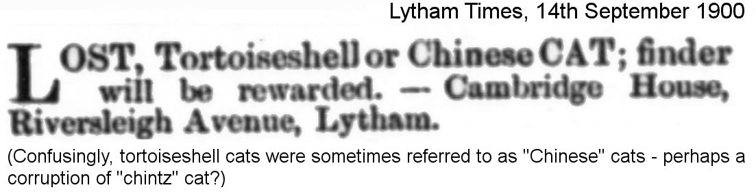 The "Thibet" cat imported by Mrs Mclaren Morrison appears to be the earliest account of a rex-coated (curly coated) cat. "A unique specimen from Thibet, said to be the first of the kind ever exhibited. This animal, which is the property of Mrs. D. M. Morrison, is black, with a covering which is more like wool than fur." (London Evening Standard, 19th October 1892). Among the curiosities at the Crystal Palace Cat Show is Lama," imported by Mrs D Morrison from Tibet, the first of the kind seen in this country. It is a rusty black with half-curled coat, not unlike that of an Airedale terrier." (South Wales Daily New, 20th October 1892). "The Thibetan cat, never before exhibited is a curious black animal with a woolly coat, as different from the long silky hair of the English cat as a negro s crop is from a modern belle s." (Exeter and Plymouth Gazette, 20th October 1892). "The cat from Thibet takes a first prize, due, perhaps, to its rarity, for such a specimen has never been previously exhibited. It is black, and its coat is more like wool than a cat's fur." (Nottinghamshire Guardian, 22nd October 1892). "A very curious beast, says the correspondent of a contemporary, came from Thibet. There is a distinct species of cat in that country which is not domesticated, but this Thibet cat was simply extraordinary variation of felis domestica. It was long-necked and lean creature, with a grey black coat, the peculiarity of which was that it was just the texture of Irish frieze. " (Preston Herald, 22nd October 1892). "The only distinctly new variety in the exhibition was a cat stated to have been imported from Tibet. This was a small, dark, slate-coloured specimen with frizzy or curly hair very much like the short hair of a negro." (Illustrated London News, 22nd October 1892)