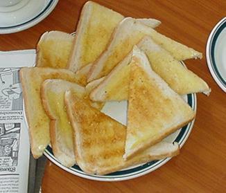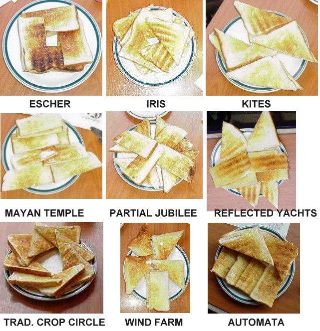 Four triangles of toast, placed in a square and leaning inwards. The hypotenuses form the base and the apexes touch to form a four sided pyramid. It is necessary to pinch or crease the toast bread at the centre of the hypotenuse so that the pyramid does not fall flat (to form what seamstresses call "a dart").