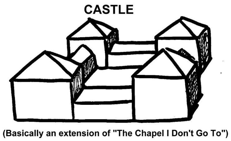 This is an extension of the Chapel I Don't Attend. The four castle towers are all baragami Spires. The four castle walls are all baragami Cottages. A double-height Spire (A spire placed atop a Closed Cube may be places at the centre of the Castle.