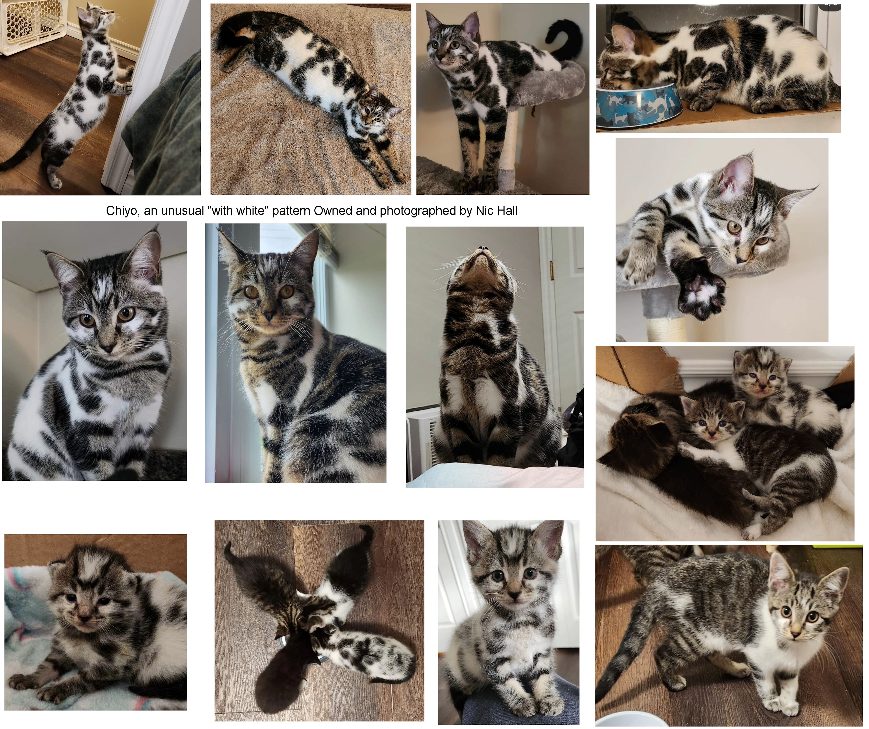 These photos of an unusual tabby and white called Chiyo were shared online by Nic Hall (and via Nayra Bernacki with permission). She had this pattern from birth so it's not vitiligo. Embryo development plays a part in the distribution of white in white-marked cats. White spotting in cats usually manifests as coloured patches on the back and white on the chest, belly and limbs through to almost solid white with residual patches of colour on the head, back and tail. Chiyo has mostly reversed this with tabby limbs and a random pattern of uneven patches on the body. The white around the eyes and on the forehead is also unusual; a white blaze or dark mask is more common, and Chiyo has the reverse of this. The coloured patches also seem to follow lines along and around the torso. Chiyo and one of her siblings have unusual white distribution. The brother has predominantly white forequarters, a coloured back legs. white spotting mutations occur from time to time. Chimerism hasn't been ruled out, and this can produce unusual patterns in animals. Chiyo has been spayed so there is no way of telling whether the pattern could be passed on.