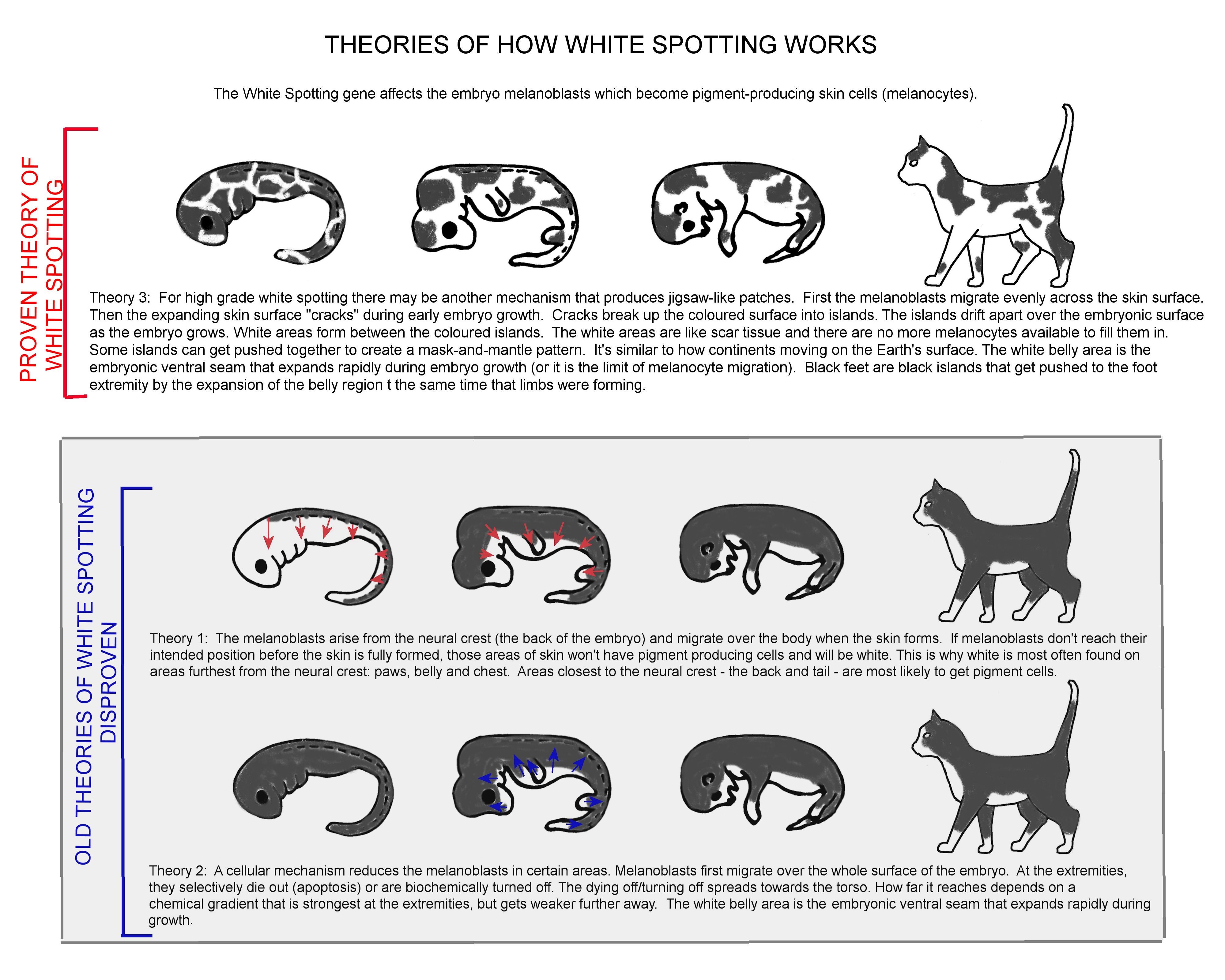 It used to be thought that when the melanoblasts arose from the "neural crest" (the area along the back of the embryo) and migrated all over the body as the skni formed. The white areas were areas that the cells didn't reach, which explained why the white is most often found on the paws, belly and chest - those areas are the most remote from the neural crest and take longest to reach. The slower the migration of cells, the less colour there will be. It also explained why the back and the tail may be coloured in an otherwise all white cat - those areas are closest to the neural crest and the pigment cells didn't have to migrate very far.