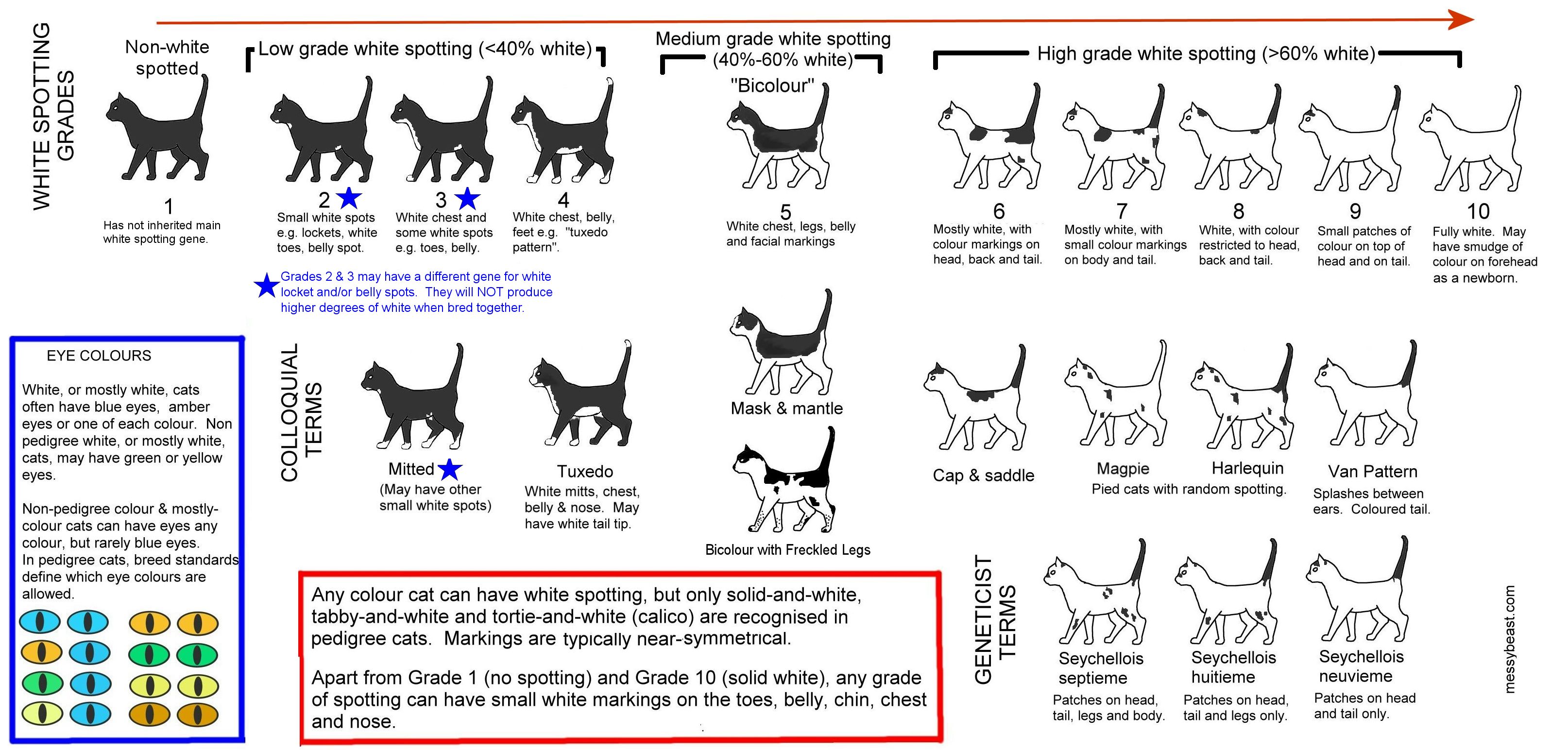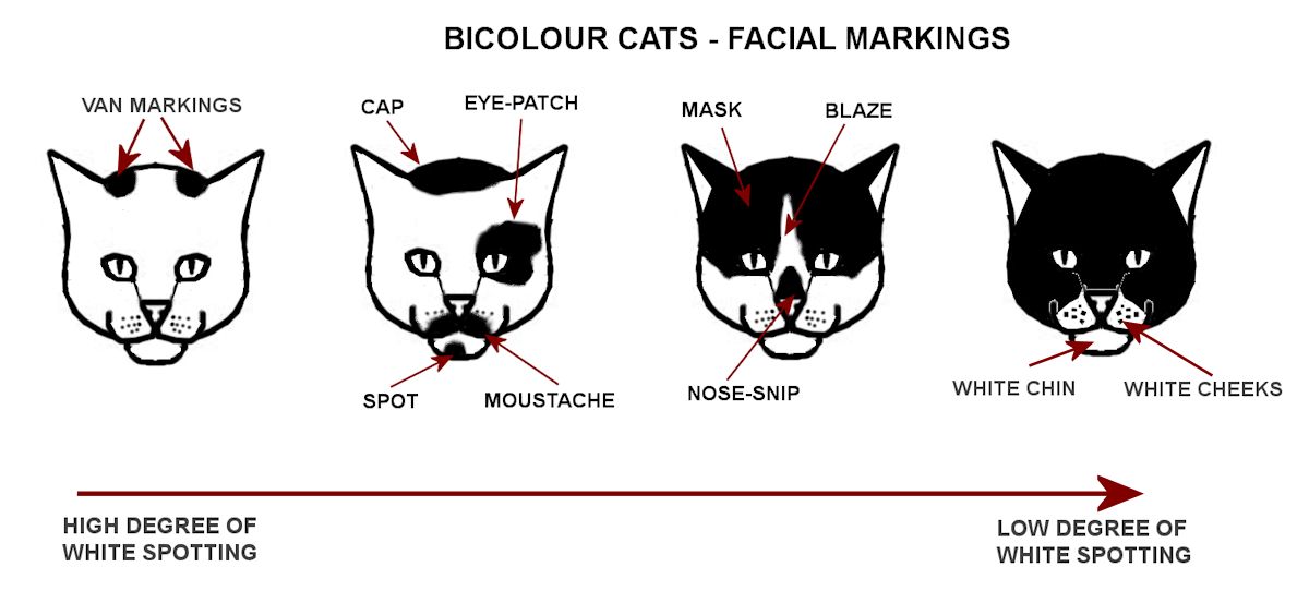 GENETICS OF PIEBALD CATSWhen the amount of white is small (under 40%), it is called low-grade spotting and comprises the white belly patch, mitts, locket and blaze. In medium grade spotting, the amount of white varies from 40% to 60% of the coat and is the typical pattern of a show quality bicolour (a mask and mantle effect). When it is extensive (more than 60%), it is called high-grade spotting - the Seychellois or Van pattern.
