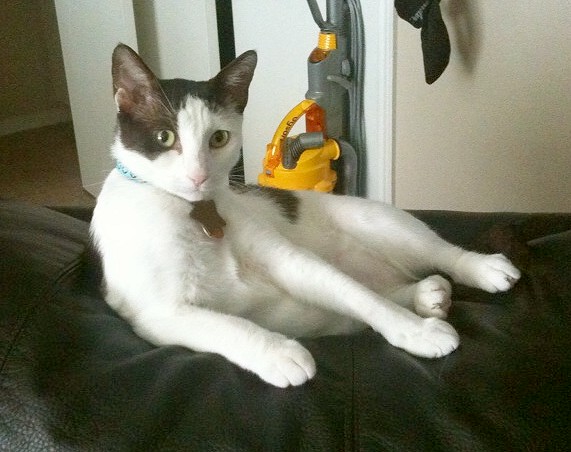In 2011, Kimberly Sexton of New York City sent these photos of her cat Frankie. Kimberly's 14 year old cat Miko (white with grey markings on his head and tail) had recently died and in his last 3 years had formed a close bond with her younger cat, Frankie, a mackerel tabby. The two cats often slept intertwined. Two years before Miko passed away, Frankie developed a white spot of fur under his neck, while his chin and nose became paler. As time passed, Frankie's white areas spread and new ones developed around his neck and behind his shoulder blades. Kimberly joked to friends that Miko's white colour was rubbing off on Frankie as they slept! Frankie's white areas are likely to continue spreading, but the effect appears entirely cosmetic.