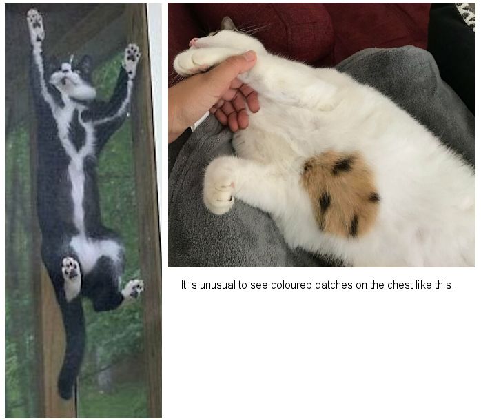 Piebald cats are extremely common and varied in appearance. The white spotting can occur with any colour/pattern and varies from minimal white through to almost all white. The smallest amount of white may be no more than a white locket and a small white belly patch, each no more than a few white hairs. Though this pattern doesn't have a descriptive namem the term "locket cat" has been suggested. The image at the top of this page and the description below is a typical progression through the different grades of piebald. Due to developmental effects at the embryo stage, there are further variations on this general theme!