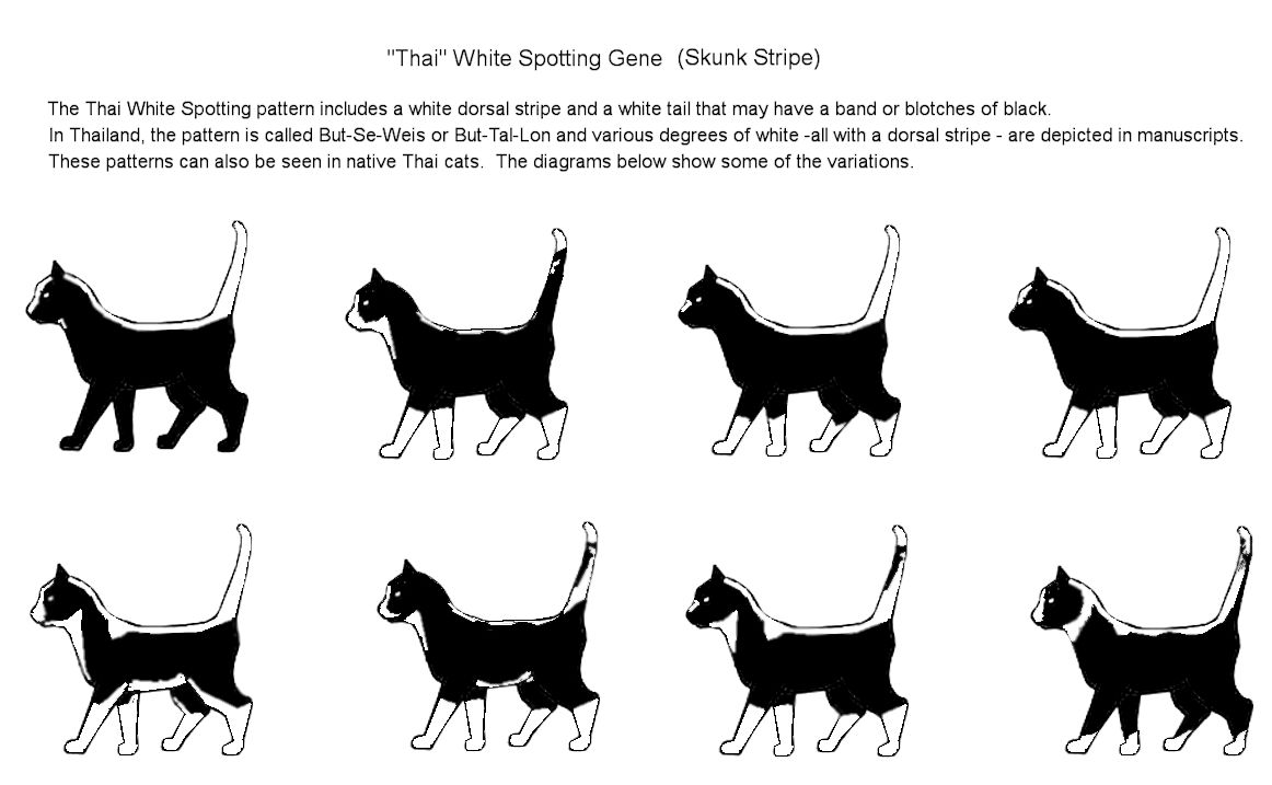 More unusual is the "skunk marking" - a white dorsal stripe. Because early theories said that pigment producing cells migrated away from the neural crest, the dorsal area itself should remain coloured in low to medium grade spotting. In the case of a skunk stripe, the crack between areas of black is a straight line along the back rather than several random cracks (it's a cat with "continents" rather than "islands"! The appearance of a white dorsal stripe is unusual and appears to be hereditary especially as it was a recognised variety of cat in old Thai manuscripts. The Tamra Maew described a number of bicolour cat patterns, one of which was the But-Se-Weis/But-Tal-Lon, a black cat with a white dorsal stripe. The descriptions were considered fanciful by many western cat fanciers, but a growing interest in Thai breeds and the ease of uploading photographs to the internet has shown that the patterns do indeed exist. It is not a recognised pattern in any Western cat breed.