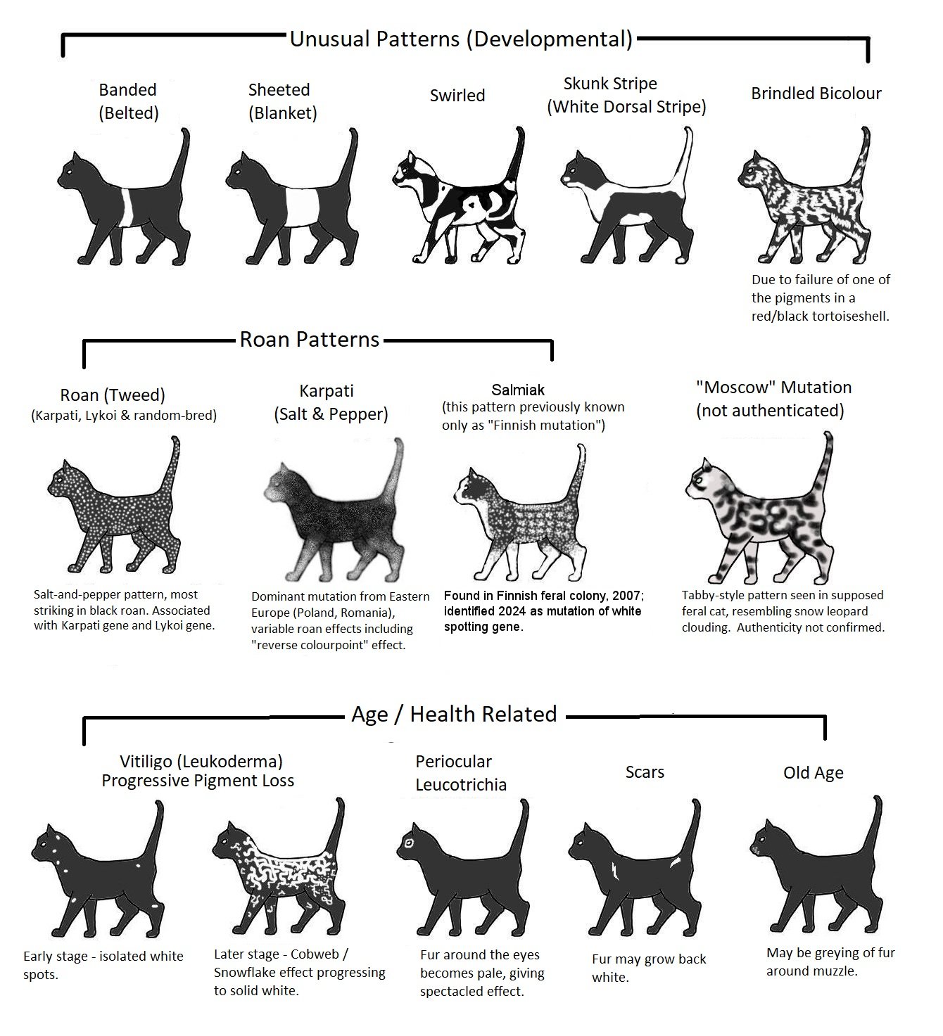 Leukoderma ("white skin"), leukotrichia ("white hair") or vitiligo, is a cosmetic condition that produces a progressive "snowflake" effect. The white spots become more extensive with age and the cat may become almost completely white. This must not be confused with the normal sprinkling of isolated white hairs which appear in a cat's fur during its lifetime. It is an "aquired depigmentation" and may be triggered by illness or environmental factors. "Charva" (Jason Reeves) has vitiligo; she was a black cat with patches of slightly longer/softer black hair. In 2009 she turned 4 and developed a patch of white hair.  Since then the patches of white have turned into stripes, spots, and patches. Her skin is turning pink as well due to the loss of pigmentation. For more information see Bicolours - Depigmentation Conditions: Vitiligo, Leukoderma, Leukotrichia.