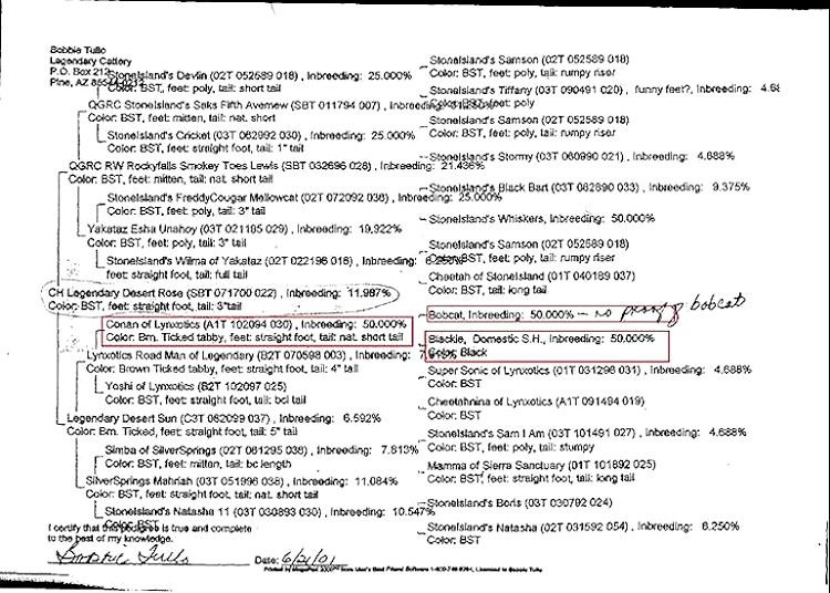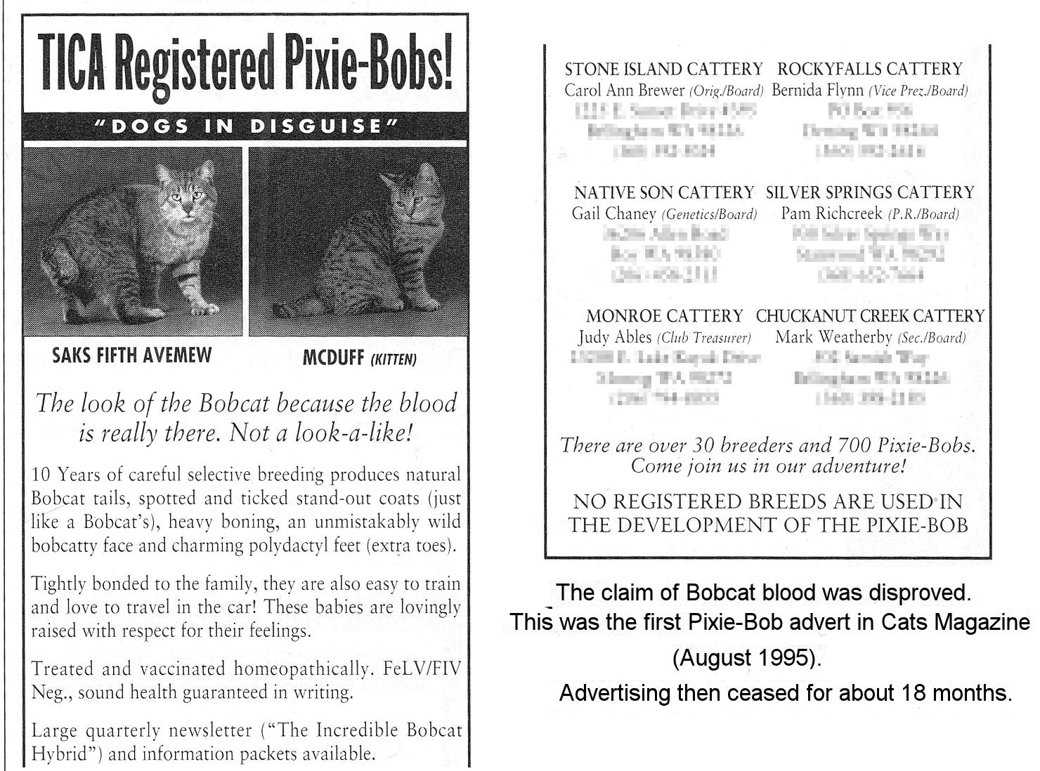 After TICA initially recognized the PixieBob there was an open registry and similar-looking cats of American Bobtail, Japanese Bobtail and Manx ancestry were likely to have been registered as foundation cats for the PixieBob breed. TICA also permitted "Legend Cats" (naturally occurring bobtails that resembled bobcats) to be registered as PixieBobs. Spotted Chausie variants also appear to have been registered as Legend Cats, and a Jungle Cat hybrid called El Gato del Oro became a prize-winning Pixie-Bob. The developing PixieBob breed was said to be a convenient way for some Chausie breeders to register or offload their spotted variants! Konnie Surmann, a PixieBob breeder of long-standing provided me with this copy of an old pedigree from June 2001. It had "bobcat" in the ancestry of a cat called Stone Island Devlin . The pedigree is hand-annotated "no proof of bobcat." The original article is at Pixiebob.org - The Pixie Bob is part Bobcat, right?