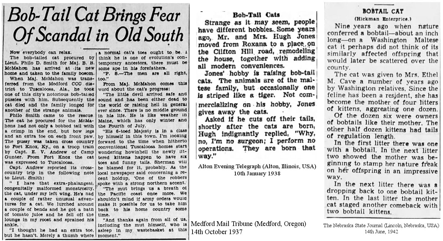As early as 1940, American zoologist Ida Mellen had written "The American Domestic Bobtail Cat of the New England and Middle Atlantic States (called the Rabbit Cat) traces its ancestry to the Manx cat, but the distribution of tailless cats is wide, covering the Crimea and other parts of Russia, the Bismarck Archipelago, the Malayan Archipelago, Burma and Siam." However nothing more was said about the purported American Domestic Bobtail. Below are some news cuttings from that period, one of which refers to a bobtailed cat with extra toes.