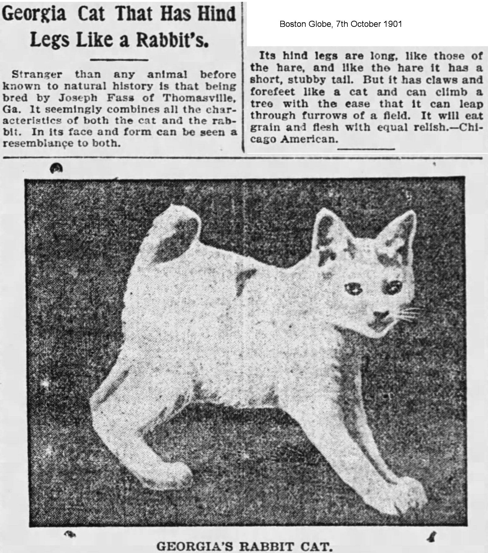 1901Boston Globe, 7th October, 1901: "Georgia Cat That has Hind Legs Like a Rabbit's."