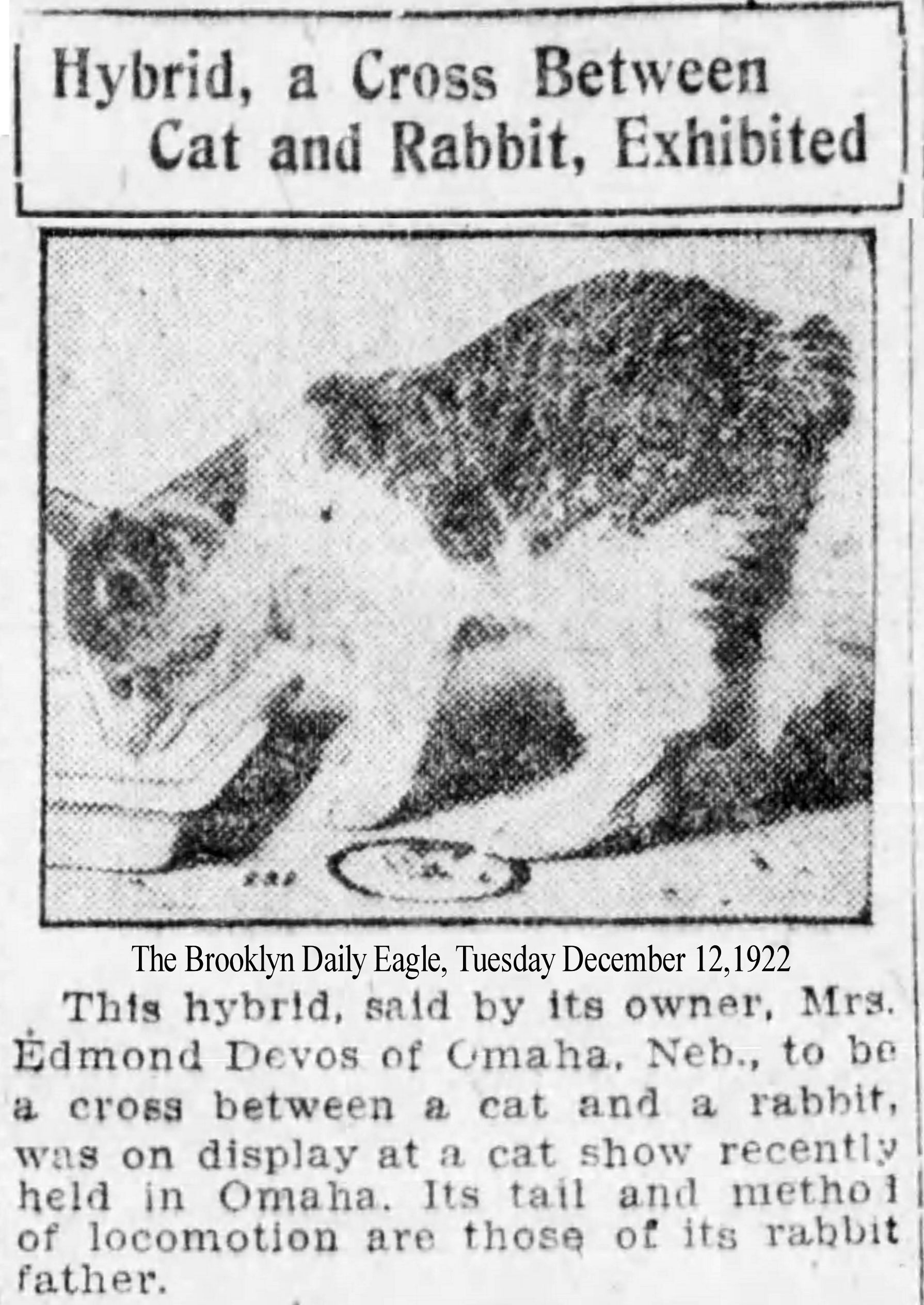 1901The Manning Times, February 27th, 1901: A Queer Animal. A dispatch from Tamaqua, Pa., says: Richard Miller of Hauto has a curiosity in the shape of an animal that is half cat and half rabbit. The front portion of the creature, with the exception of its red eyes, is that of a cat, while the rear half is that of a rabbit. One half of the animal s body is covered with the white hair of a cat, while the remainder of its body is covered with the reddish brown fur of a rabbit, ending in a short, bushy tail. It moves about with half run and half hop, and is very tame. It lives on vegetables and milk, and has no use for meat. It is about one-half the size of a full-grown cat.