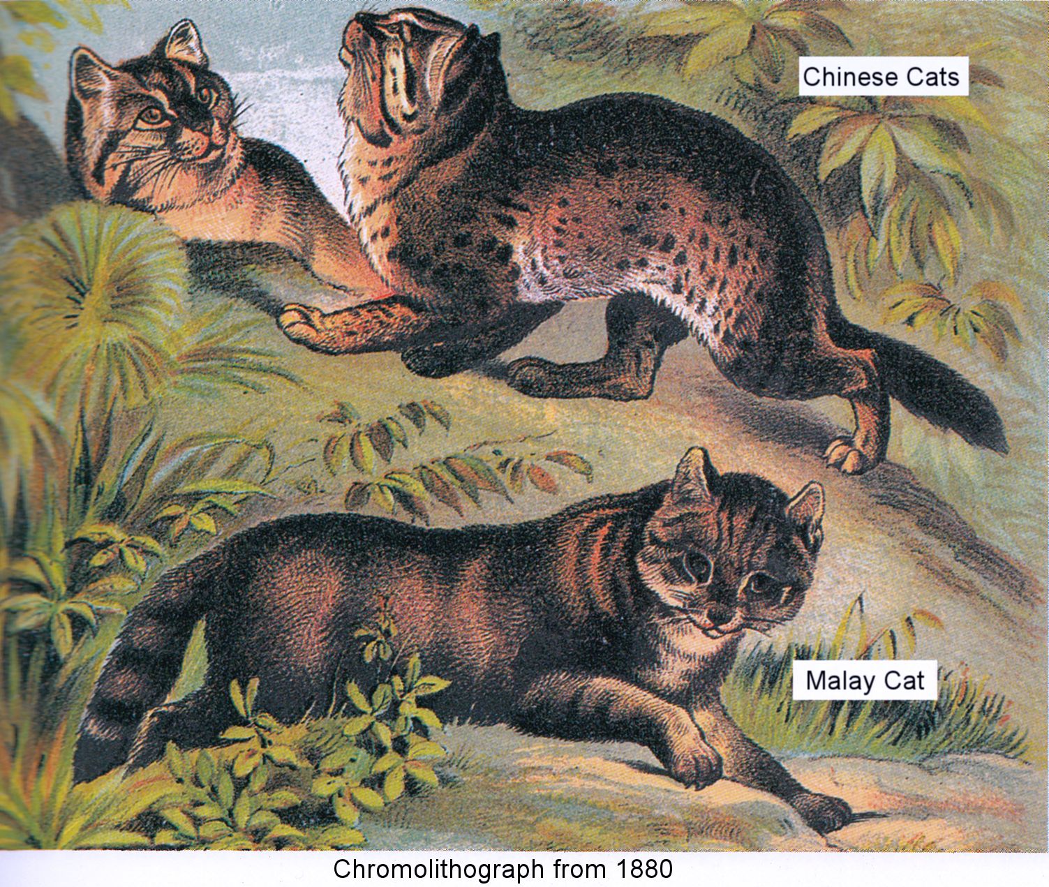 "Very curious and handsome is the Indian cat[…] His most striking peculiarities are the length and slenderness of his limbs, the extreme shortness of his coat, and his thin and tapering tail […] His ears are small, but as a kitten they were of enormous size, and with his long and pointed head gave him a most weird experience. The voice of this cat is very variable, and far more resembles the raucous call of the Siamese than the voice of any European cat." In retrospect, this is an Oriental cat rather than a variety descended from indigenous wildcats, but in Brooke's time only the only recognised Oriental was the Siamese. The variety had probably reached Bombay the same way it left - on shipboard from Thailand or the Malay Peninsula. The Siamese of that time was far less extreme than the modern variety and the illustration shows the Indian cat as similar to an Abyssinian.