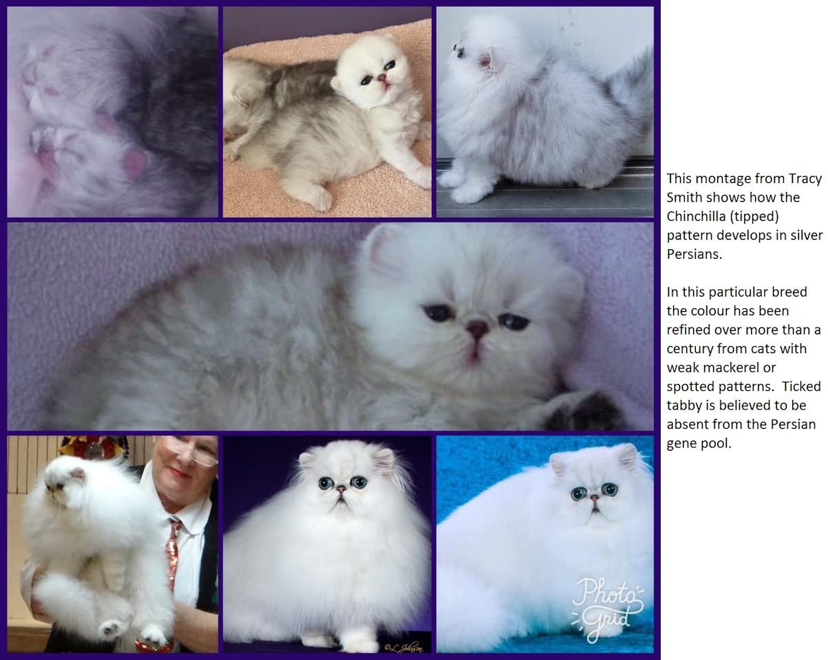 This is the lightest degree of tipping. Only the hair tip is coloured while the hair shaft is silver. Chinchilla Longhairs (Persians) have been around since the late 1800s and the pattern has been refined over many decades so that the underlying tabby pattern is diffused. Ticked tabby Persians exist, but most registries don t recognised the pattern and some breeders believe that a ticked tabby Persian is a sign of outcrossing to Exotic Shorthairs (which not all registries permit). The founding mother of Chinchilla longhairs may have been a weakly marked silver mackerel or spotted tabby longhair and breeders have selected for minimal markings ever since. Most other tipped cats cats are ticked tabbies (usually) with the inhibitor and a greater degree of wide-band. These cats have a sparkling appearance.
