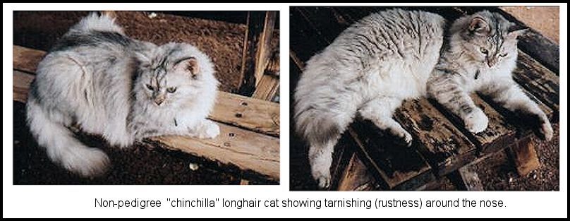 Sometimes the Inhibitor gene fails to completely block pigment (it is more effective at blocking black-based pigment than blocking red-based pigment) and there is a breakthrough of reddish colour known as "tarnishing". Tarnishing is common on the muzzles of random bred silver tabbies, but rare on pedigree silver tabbies due to selective breeding and refinement.