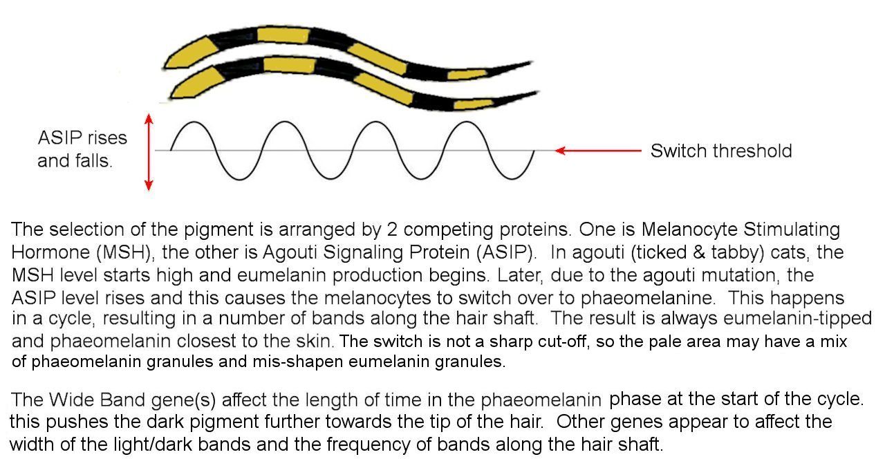 Additional genes influence banding frequency, band width and band placement on the hairs. An ideal Shaded Silver hair has a single broad band of pigment at the tip of each hair. In life, Shaded Silvers have a mix of three patterns: a single broad band and wide undercoat; a few broad bands and wide undercoat or multiple thin bands (as seen in the background colour of Silver Tabbies). The criteria for each degree of tipping is an ideal and there are many cats that visually fall between two ideals.