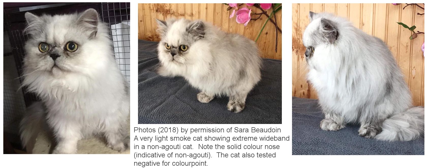 The inhibitor gene has a variable effect, probably due to polygenes. The photos provided by Sara Beaudoin at first look like a shaded silver, but a closer look shows him to be a black smoke i.e. non-agouti with extreme widebanding. The solid colour nose is indicative of non-agouti and this was confirmed by DNA testing. (The classification of smoke and shaded silver varies between registries. In some, such as CFA, chinchilla, shaded and smoke only refer to the length of tipping, not whether the cat is agouti or non-agouti. Being so far from the standard from smoke, this cat is black shaded silver, though that colour is not recognized in any major association.