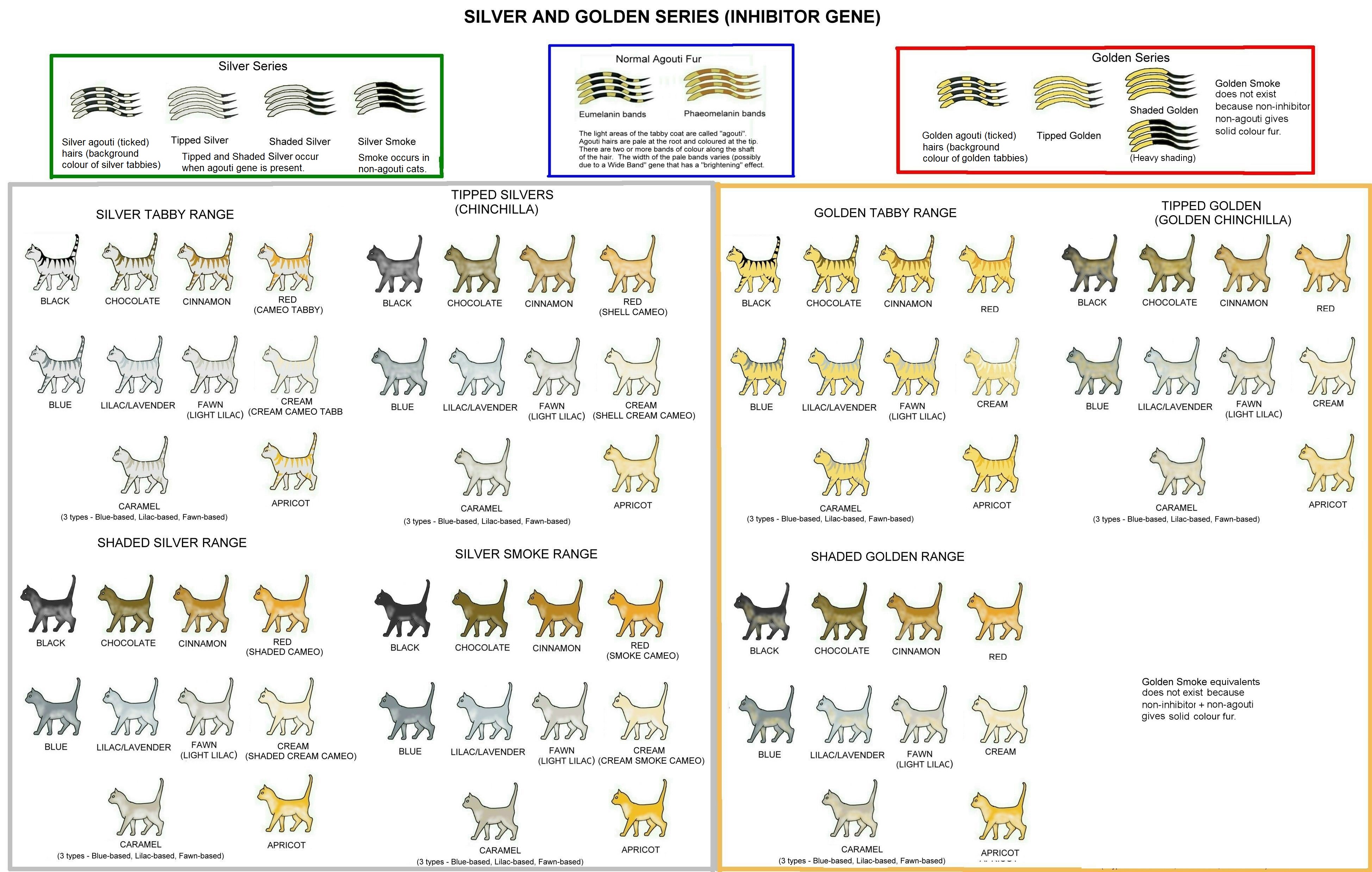 This theory is shown below; the "silver agouti" means a tipped or shaded cat. The Wide Band effect is necessary to widen the pale areas of the agouti hairs. Because smoke cats are non-agouti, a "golden smoke" is impossible. The naming convention is fairly standardised hence [colour-name] indicates the tipping/shading colour e.g. Blue Shaded Golden, Tortoiseshell Golden Chinchilla. Where a cat is described with no addition "colour-name" the tipping/shading/tabby etc is assumed to be black. The Golden Tabby is equivalent to the Silver Tabby with distinct markings on a golden background.
