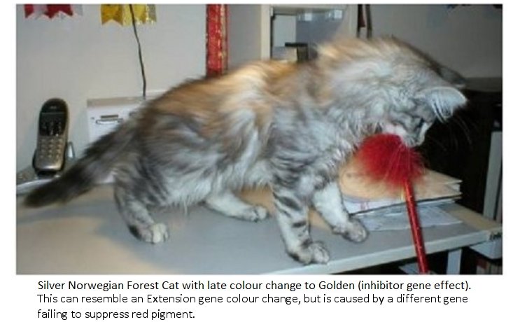 Other colour changes can have a superficial resemblance to extension gene colour changes. This Norwegian Forest Cat was bred by Yve Hamilton Bruce from a silver mackerel tabby female (imported from Denmark) and a classic red tabby and white male. The result was 1 silver tabbies and 2 silver tabbies with white. At just over 3 months old, this silver and white tabby male developed a large patch of bright red hair on his back (as shown) which continued to spread until he was completely golden. Though similar to an amber colour-change, this is an unusual silver-to-golden change related to the inhibitor gene. Though it superficially resembles amber, this particular colour change is related to the inhibitor gene.