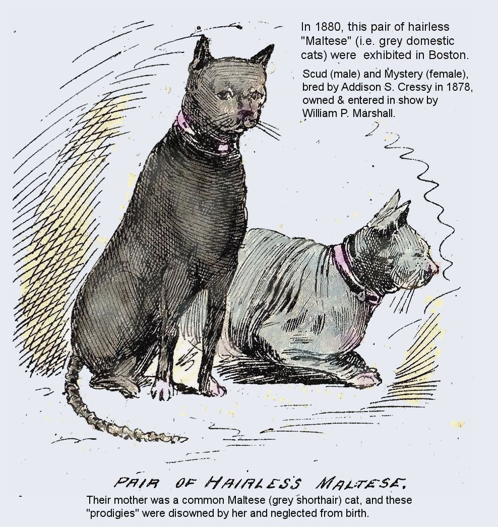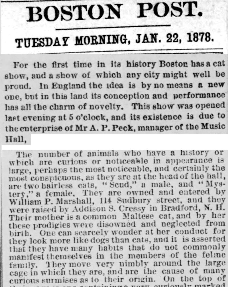 Although there are written accounts from the 1830's of a Paraguayan "scant-haired cat", the first detailed report of hairlesscats I have so far found is in 1878: "POOR PUSS. Boston Post, January 22, 1878 [...] For the first time in its history Boston has a cat show [...] its existence is due to the enterprise of Mr A. P. Peck, manager of the Music Hall, [...] The number of animals who have a history or which are curious or noticeable in appearance is large, perhaps the most noticeable, and certainly the most conspicuous, as they are at the head of the hall, are two hairless cats, “Scud,” a male, and “ Mystery,” a female. They are owned and entered by William P. Marshall, 114 Sudbury street, and they were raised by Addison S. Cressy in Bradford, N. H. Their mother is a common Maltese cat, and by her these prodigies were disowned and neglected from birth. One can scarcely wonder at her conduct for they look more like dogs than cats, and it is asserted that they have many habits that do not commonly manifest themselves in the members of the feline family. They move very nimbly around the large cage in which they are, and are the cause of many curious surmises as to their origin."