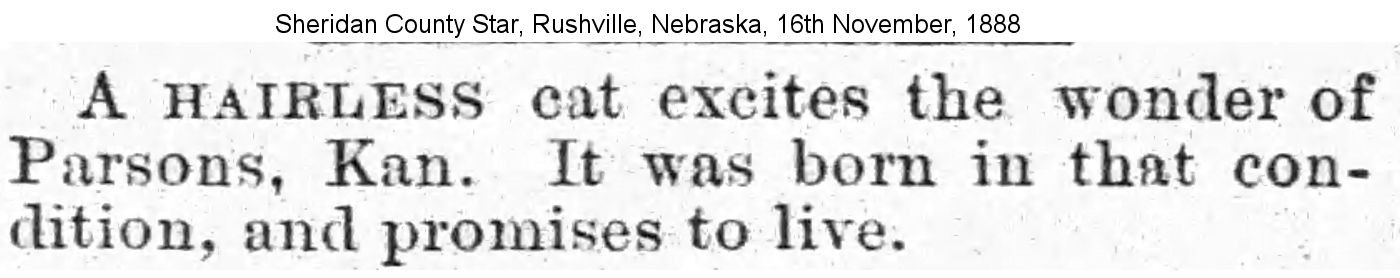 The Wilmington Messenger (Wilmington, North Carolina) of 1st October, 1893 describes an apparent random mutation (or a hairless puppy passed off as a cat) "We were shown yesterday a strange freak of nature in the shape of a hairless cat - or part dog and part cat, as really seems to be the case. The monstrosity very much resembles a hairless Mexican dog, but is cat shaped and is as playful as kittens in general. The ears are quite large and so are the paws, although at present there is no sign of claws. When the animal sits and raises its head it looks very much like a dog from the neck down to the forefeet. It was one of a litter of five kittens now four weeks old. The other kittens have hair and are natural in appearance and hardly half as large as their strange sister. The nondescript is not only large and stronger than the other four kittens but it is smarter and particularly full of life."