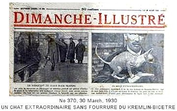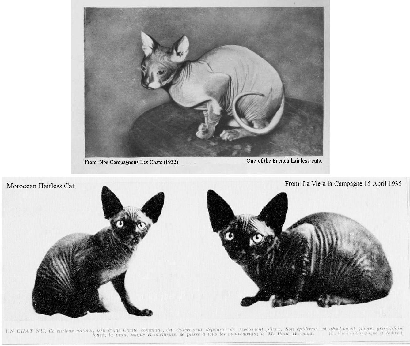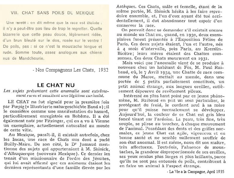 Hairless kittens (Bald Cats) appeared in in France (1932) but failed to thrive. In April 1935, the magazine "Vie A La Campagne" (Life in the Country) carried pictures from a 1932 cat show in Paris which had featured two hairless cats called "le chat nu" (the naked cat) shown as curiosities by Professor E Letard. The naked cats had been born to two different domestic females in the same household at Kremlin-Bictre, near Paris,in 1930 though both died without reproducing in 1931. The cats had been born 4 months apart and were exhibited at the Feline Exposition in Paris. This suggests a degree of inbreeding allowing a recessive gene to be expressed. Some later reports refer to the French Sphynx being "resurrected" , but this would refer to the resurrection of hairless cats in general, not to a French strain. The French Sphynx (Le Chat Nu) never became an established breed in its own right.