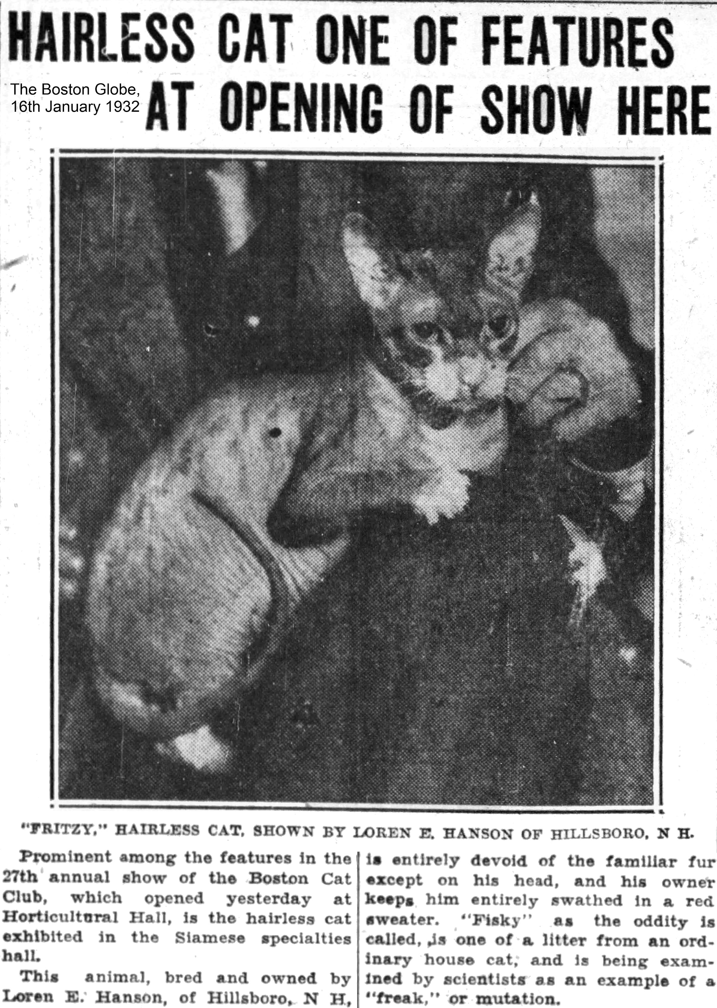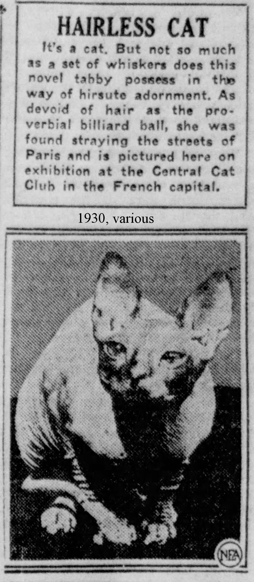 Santa Ana Register (California), 14th May, 1930 – “It’s a cat. But not so much as a set of whisker does this novel tabby possess in the way of hirsute adornment. As devoid of hair as the proverbial billiard ball, she was found straying the streets of Paris and is pictured here on exhibition at the Central Cat Club in the French capital.”
