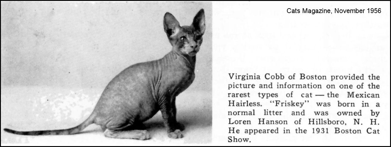 The first recorded hairless "breed" was the now extinct Mexican Hairless (also called the New Mexican Hairless). The full story is given on the linked page, but in brief in 1902, a Mr and Mrs Shinick from New Mexico received two hairless cats, Dick and Nellie from local Pueblo Indians. It was claimed that these were the last survivors of an ancient Aztec breed of cat. The Mexican Hairless cats were litter-mates and noted to be 25% smaller than local shorthair cats. They were normally whiskered and seasonally coated, growing a ridge of fur down the mid-back and tail during the colder seasons. The male was killed by dogs while young and the owners could not find a suitable hairless mate for the female. In fact the female could have been bred to similarly shaped domestic cats and the offspring back-crossed to their mother to re-establish the hairlessness trait. The Albuquerque Journal, 17th December, 1908 detailed Nellie’s planned train journey to Washington to meet the President and First Lady, and then to New York for the cat show. Nellie was to be in the care of well-known cat enthusiast Dr. Cecil French, who would take her to New York City to exhibit her at the annual cat show in Madison Square Garden commencing December 30. It was to be Nellie’s last journey. A follow-up article from The Albuquerque Journal, 29th December, 1908 tells us she was bred and raised by Mr. Shinick (an admission of her origin at last!) and had been unwell when she left Albuquerque by train and died the day after reaching Washington. The immediate cause of death was dropsy (wet FIP), but her spleen, liver, kidneys and uterus were all found to be diseased and even without dropsy, Nellie would not have lived much longer. Her body was donated to the Museum of Natural History/Smithsonian Institute in Washington, D. C., for display, but has since been lost.