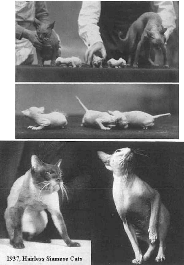 In 1938, Professor Etienne Letard (Professor at the National Veterinary School of Alfort (Seine) France) replied in the Journal of Heredity in a letter titled 'Hairless Siamese Cats'Hairless Siamese Kittens And Their Parents: Two views of hairless Siamese kittens twelve hours old, and their parents. All of them are hairless though one has a thin coat of short hairs. Note the fur distinctly visible on one of the kittens. This is especially thick on the ears and in the axes of the limbs. It disappears in a few days, being followed a short time later by another transitory coat. The two accounts of "Nonesuch", the alleged cat-dog hybrid in the Journal (March and September, 1937), have greatly interested the writer because he has had an opportunity to study a startingly similar variation in Siamese cats. The accompanying photographs show the appearance of the hairless cats, whose resemblance to "Nonesuch" is obvious. The origin and description of this hairless strain follows. A pair of Siamese cats, perfect in type with normal hair and coloring, produced from time to time one or two hairless kittens in a litter consisting otherwise of normal kittens. From these periodically appearing hairless individuals we have been able to create a strain of hairless cats, which we believe to be entirely pure.