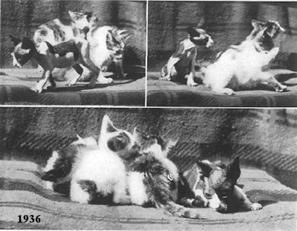 It is said that before the kittens were born, the mother cat was often engaged in fights by a mixed-breed dog in the neighbourhood, and on several occasions was badly frightened by the dog. This is about the only plausible explanation as to why the "nonesuch" is so unusual in appearance. In fact, this little animal - now about two months old – is about the queerest looking creature one could hope to set eyes upon. Its face is that of a black, white, and yellow spotted dog. Its ears are quite long and sharp pointed. It has the short whiskers of a puppy. The hind legs are amusingly bowed. It has a stub tail. What makes the nonesuch even more unusual appearing is the short smooth dog hair all over its cat-like body.