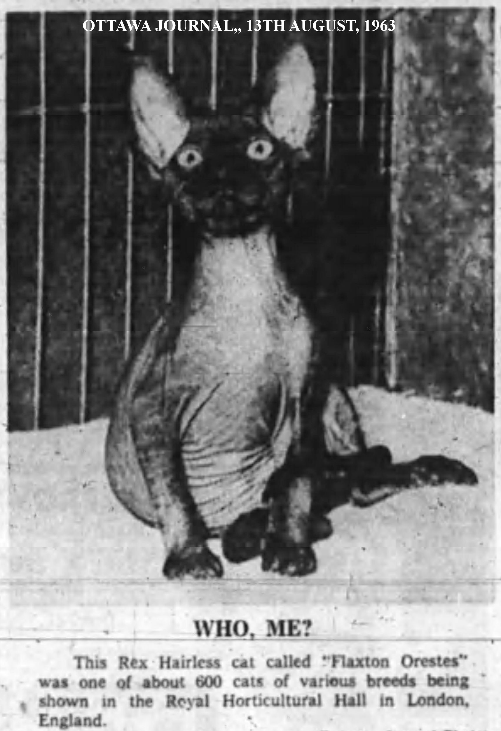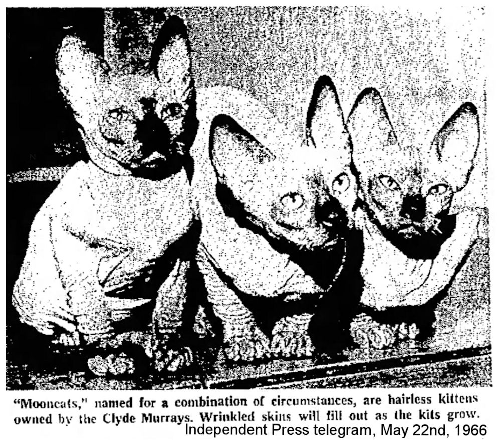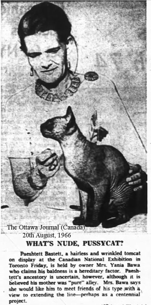 The Ottawa Journal (Canada) 20th August, 1966, under the title “WHAT’S NUDE, PUSSYCAT?” gives us this: Paeshtett Basiett, a hairless and wrinkled tomcat on display at the Canadian National Exhibition in Toronto Friday, is held by owner Mrs. Yania Bawa who claims his baldness is a hereditary factor. Paeshtett's ancestry is uncertain, however, although it is believed his mother was "pure"' alley. Mrs. Bawa says she would like him to meet friends of his type with a view to extending the line - perhaps as a centennial ’ project. [. . . ] Hairless cats for owners with allergies may soon be available, says Riyadh Bawa. owner of a hairless tomcat named Prune who is appearing at the Canadian National Exhibition this year. Bawa said in an interview today that chances are that Prune can make cat history by becoming "big daddy" to a new breed of hairless cats in the next five or six years. “Think what a boon that would be to cat levers with allergies.'' said the University of Toronto graduate student. “The cats must remain hairless for seven generations to be recognized as a breed.”