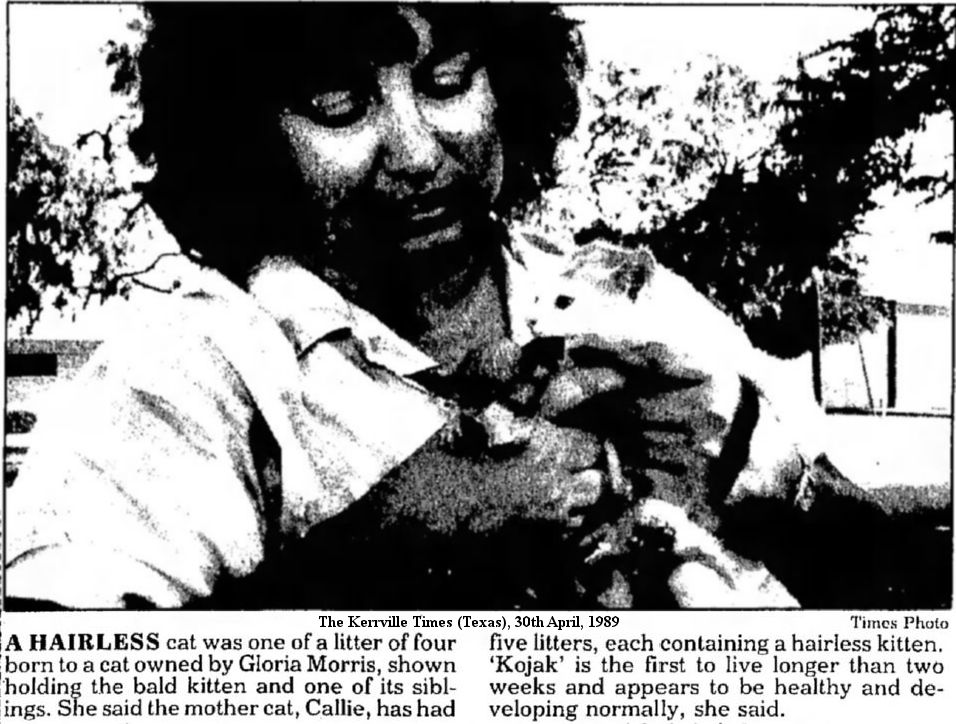The Kerrville Times (Texas), 30th April, 1989 - A HAIRLESS cat was one of a litter of four born to a cat owned by Gloria Morris, shown holding the bald kitten and one of its siblings. She said the mother cat, Callie, has had five litters, each containing a hairless kitten. ‘Kojak’ is the first to live longer than two weeks and appears to be healthy and developing normally, she said.