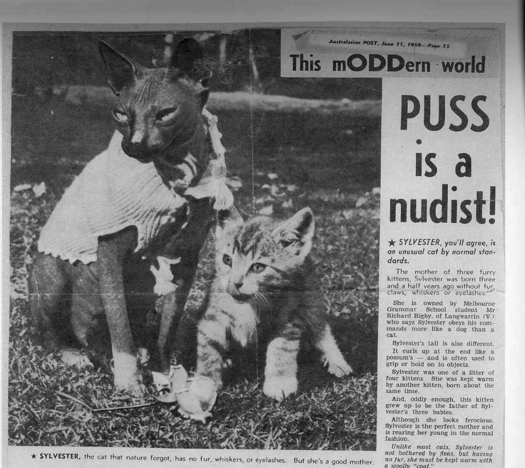 In June 1959, the Australian Post reported a hairless female cat called Sylvester. Sylvester was born in 1956 without fur, claws, whiskers or eyelashes. Her tail curled up at the end "like a possum's" and she curled it around objects. The cat (which appears to be a black with white locket and boots) was owned by Melbourne Grammar School student Richard Rigby of Langwarrin who reported Sylvester was dog-like in her ability to obey commands. Sylvester was one of four kittens in the litter and was kept warm by one of the other kittens. That other kitten, a male, was later mated to Sylvester and in 1959, Sylvester had 3 fully furred kittens. It was reported that Sylvester was not bothered by fleas and that she wore a woolly coat to keep her warm. The lack of claws suggests a general failure to produce keratin. Nothing further seems to have been heard of this mutation.