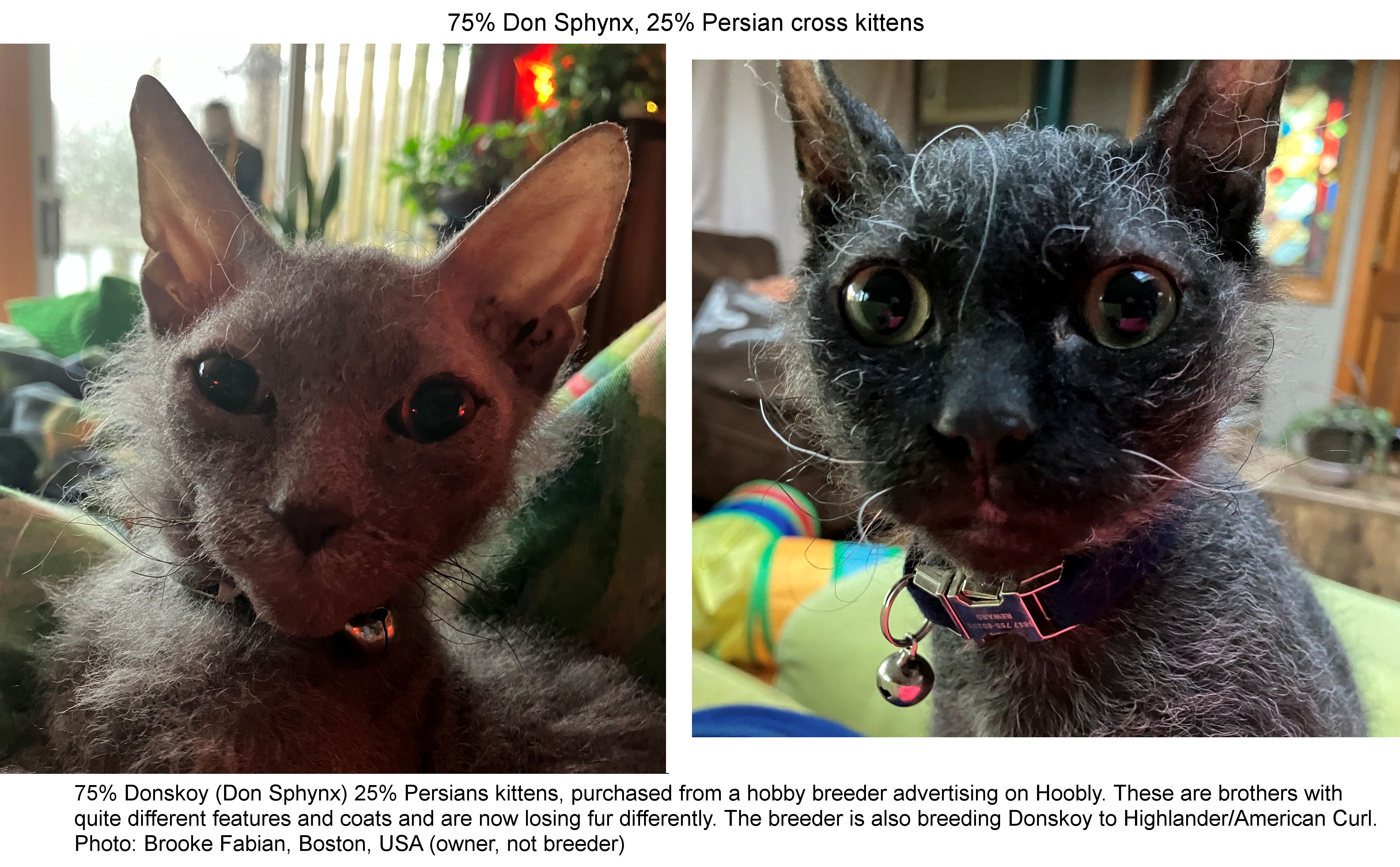 Throughout the world there are still reports of hairless kittens appearing in litters of feral cats and house cats. Hairless cats found in domestic cat litters may still be used in the Sphynx breeding programme to strengthen and expand the gene pool. Some of them are producing extremely hairless offspring, suggesting that several genes may be involved, not just a single simple mutation. Others, like the much more recent Peterbald (discussed later), prove incompatible with the Canadian Sphynx because they have a different mutation. In the USA, hairless cats have been found in North Carolina, Minnesota, Texas, Arkansas and Indiana. In Canada they have turned up in Toronto and in Western Canada (no precise location given). They have also occurred around the world although to date only the Canadian, Russian and Hawaiian mutations have given rise to distinct breeds.