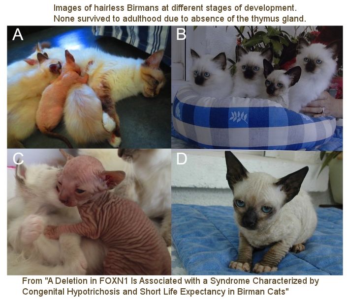Post mortem examination of 9 hairless Birman kittens born to two normal parents in Switzerland revealed the thymus was absent, and there was lymphocyte depletion in the spleen and lymph nodes. The pedigrees indicated an autosomal recessive inheritance for this syndrome that combines congenital hypotrichosis and thymic aplasia (thymus fails to form).