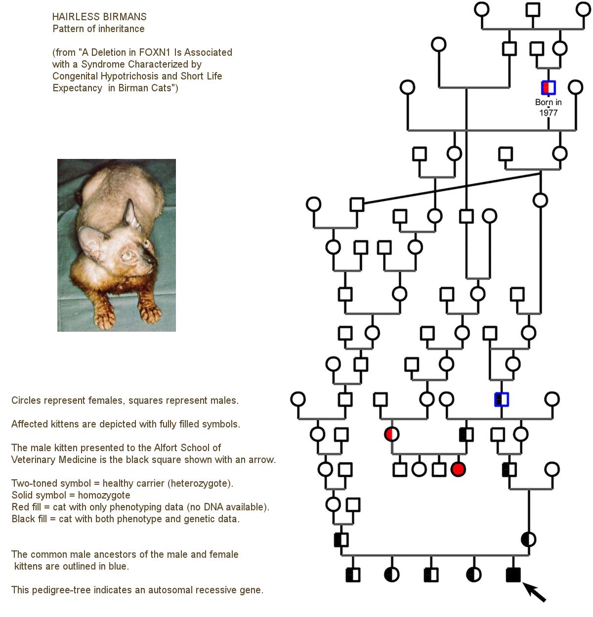 In 2013, a male kitten was presented to the Genetic Consultation at the Alfort School of Veterinary Medicine, France. He was the only hairless kitten in a litter of five born to two normal Birman parents. A cheek swab was taken for DNA study. This male died at home at four months of age, from severe diarrhoea, probably due to infection. His pedigree revealed that his mother was related to a Birman male known to have sired a hairless female in 2004. That female was euthanized at seven months due to repeated skin infections, but no tissue or DNA samples were taken. Both kittens were born hairless and developed sparse, shortened and fragile fur. Their skin was wrinkled and greasy-looking. Initially, they were as active as their littermates and grew normally. The kittens shared a common ancestor born in 1977, and now known to have produced several hairless kittens.