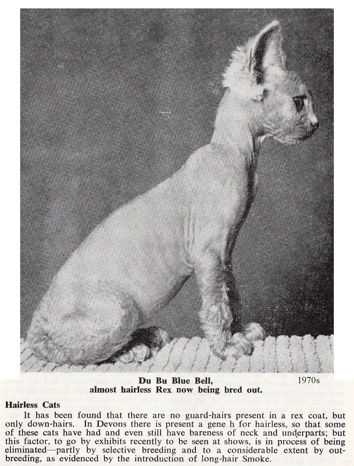 It was reported (in 1966, probably referring to the 1930s kittens) that Professor Étienne Letard of L'Ecole Nationale Vétérinaire d'Alfort in France had "resurrected" the breed of bald cats and it was noted that there were a few examples in Europe and America. The cats were reported as not born completely bald. The kittens had very light hairs which have scarcely thickened by the growth of a slight down during the first two months. After the kittens are weaned, this down falls away to leave them completely smooth. At the time, they are described as sensitive to cold, unaesthetic and not much admired by cat lovers and having only a technical interest. The report noted that the mutation had been fixed, but the breeding of bald cats was a flirtation for the specialist and did not have a great future.