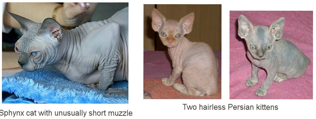 Sphynx cats are homozygous for an autosomal recessive hairless allele (hr or Canadian hairless) of the KRT71 (keratin 71) gene. Donskoy and Peterbald breeds carry a semi-dominant hairless mutation, not yet identified. A deferred lethal gene has now been identified in Birman cats.