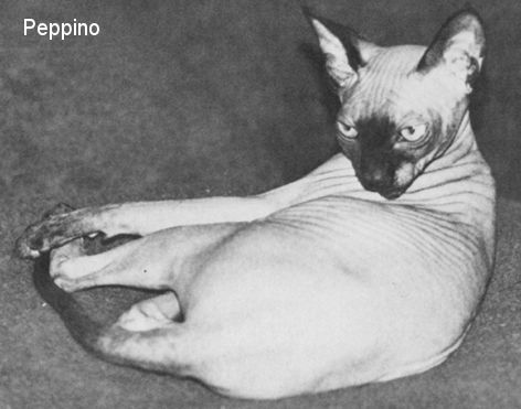 Peppino was a spontaneous hairless cat reported in 1982. She was born to a friendly pregnant stray cat that had four kittens - three black with white bibs and feet, but the fourth kitten was hairless and so much smaller than her littermates that it was initially assumed she was premature and unlikely to survive. Peppino survived, but being the runt needed human help. At two months old she grew some fuzz on her face, lower legs, feet and tail and looked like a small, grey Siamese, except that the grey was grey skin, not fur.